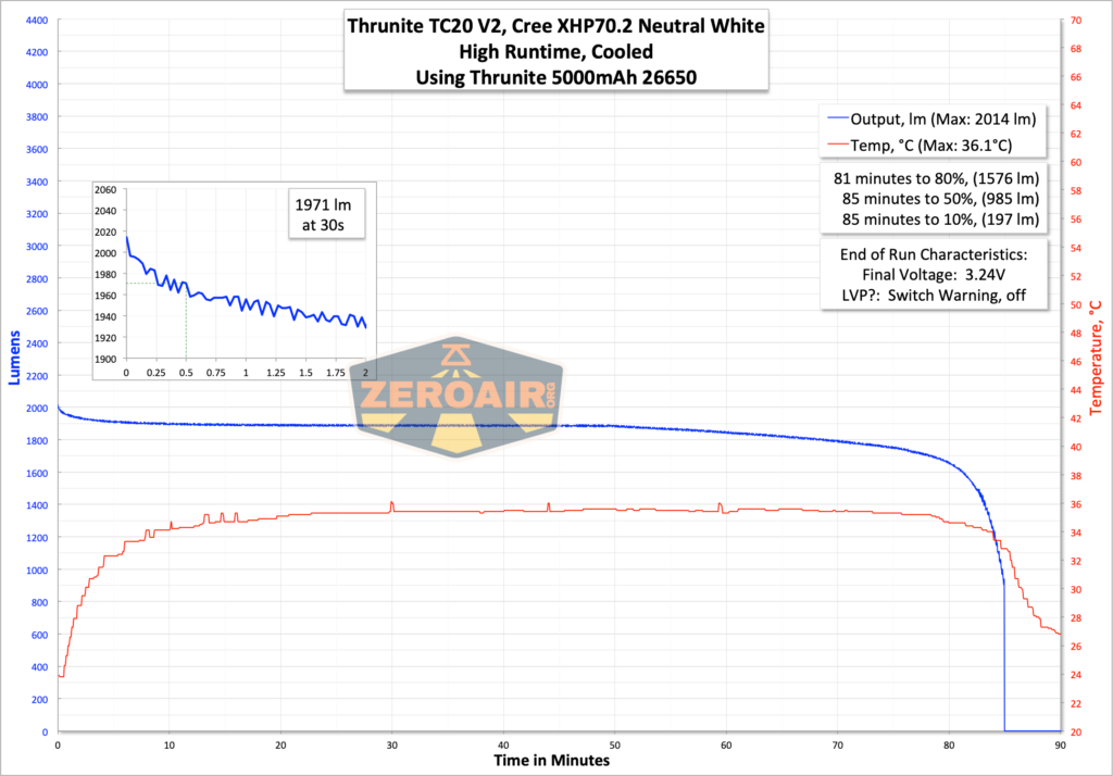 I performed a few runtime tests (more on that in a big). You can see that the light never gets TOO hot (you’ll notice the heat). Turbo has a couple of fairly large stepdowns, but even disregarding that, we’re seeing over 2000 lumens out of a small, single-26650 flashlight for well over an hour. This is not shabby.