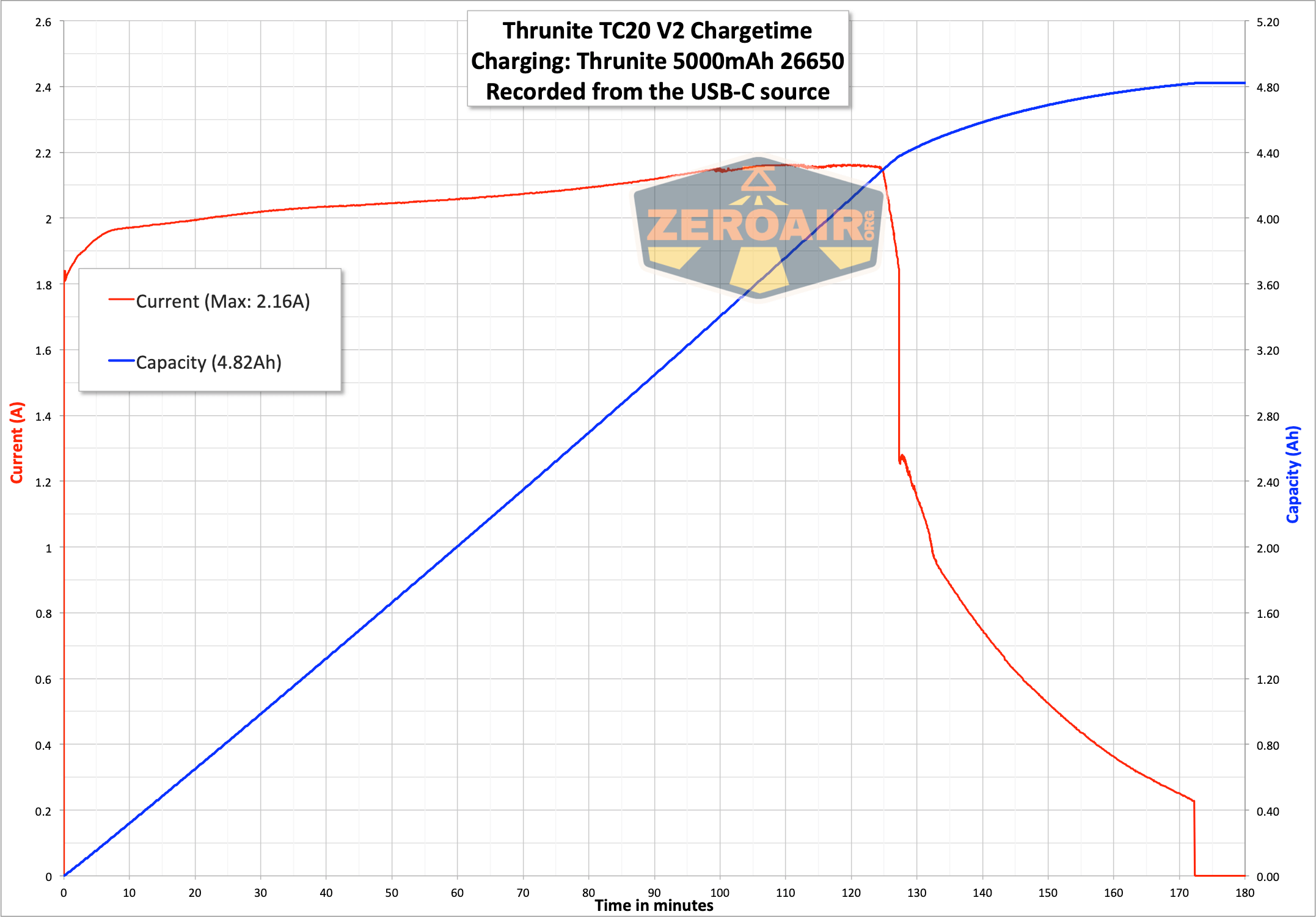 Here’s a charge graph with USB to USB-C. This is the same setup as the cable included, so I’ll guess this is the intended means of charge. Charging looks great, at well over 2A for the duration of the CC phase. This is still under 0.5C for the 5000mAh cell, so this is very acceptable.