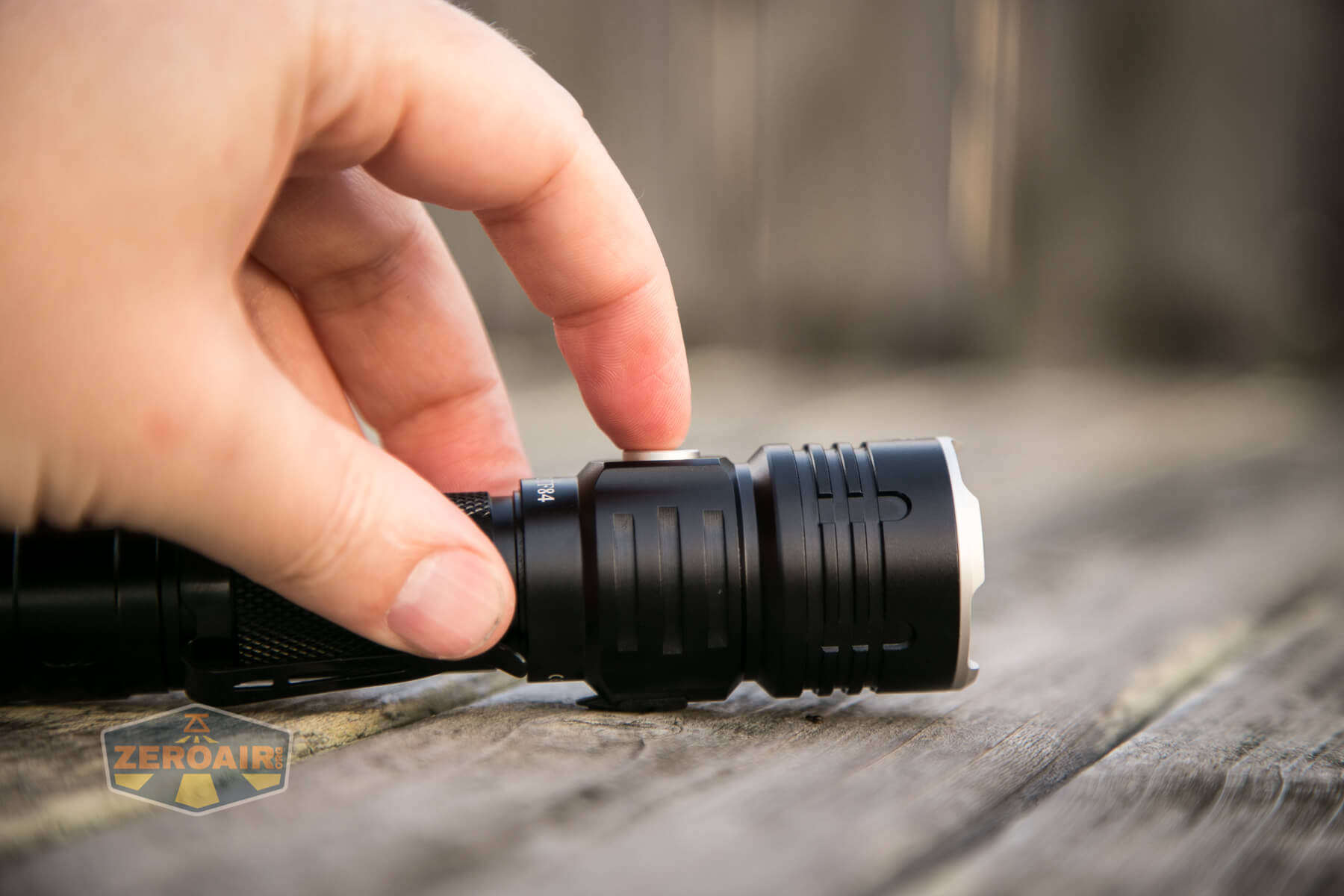 Even without the remote switch (which we’ll cover below), there are two mode groups. One is the “Outdoor Group” (this is the default) and the other is the “Tactical Group.” To switch between these groups press the paddle switch (the manual calls this the “tail mode switch”) and the side e-switch at the same time, for around 3 seconds. The light will change groups. Three blinks indicate you’ve entered the Outdoor group. One blink indicates you’ve entered the Tactical group.