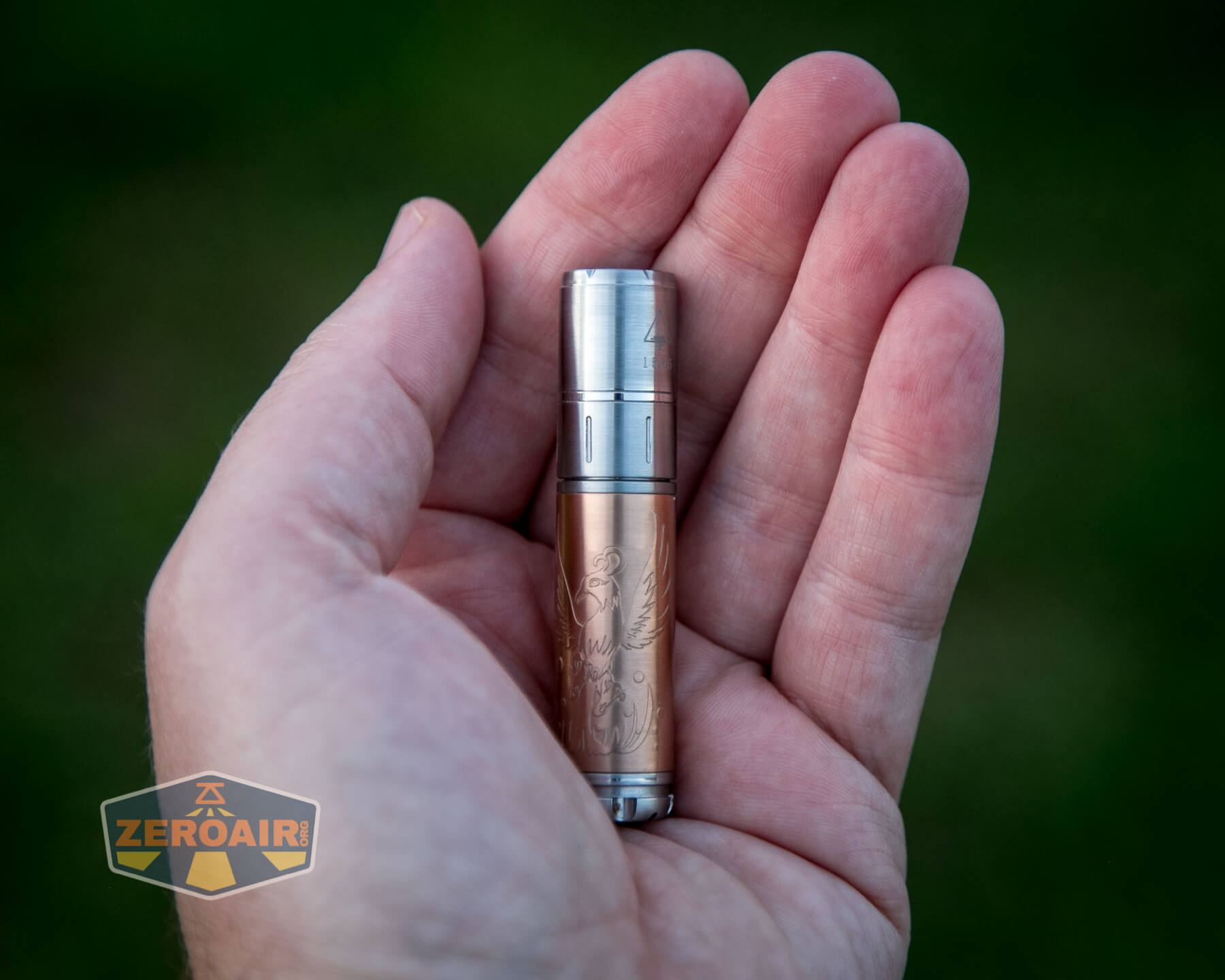 Alright, it’s a twisty. You probably know I don’t love twisties. But this one is quite neat with the copper sleeve (sleeve?) and anniversary branding. For those reasons, I have really enjoyed this light! Of course, XP-E2 is a bit dated….