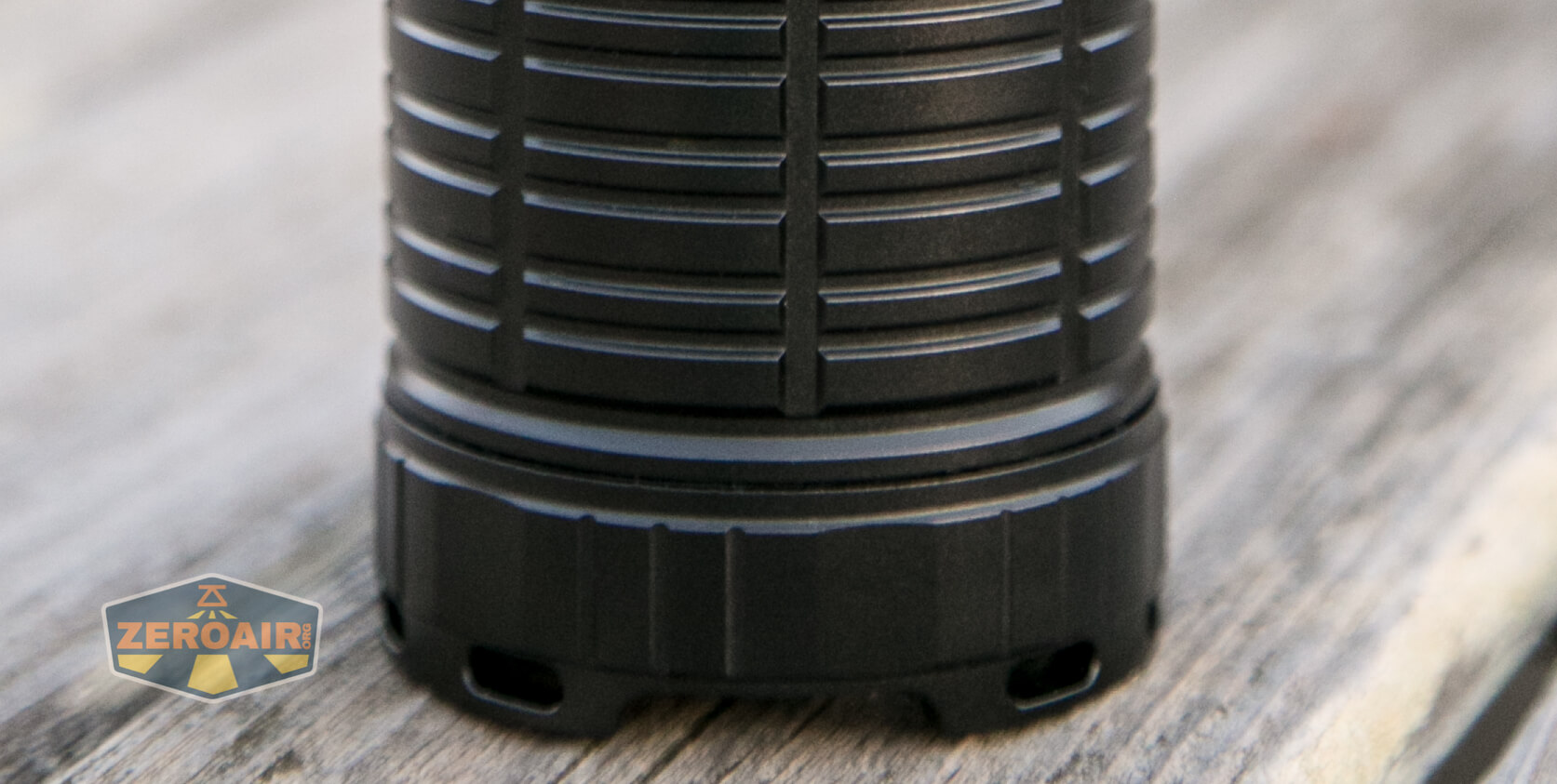 The only place to take the light apart is here – the cell holder comes off the head. These threads are anodized, square-cut, highly lubed, and very smooth. They’re short too, which is nice. I don’t usually love screwing down a cell tube while the cells gets twisted around the head contacts (which is why I often prefer cell holders, which then slip into the body). But there are a couple of things that make it “ok” here (and one that doesn’t).