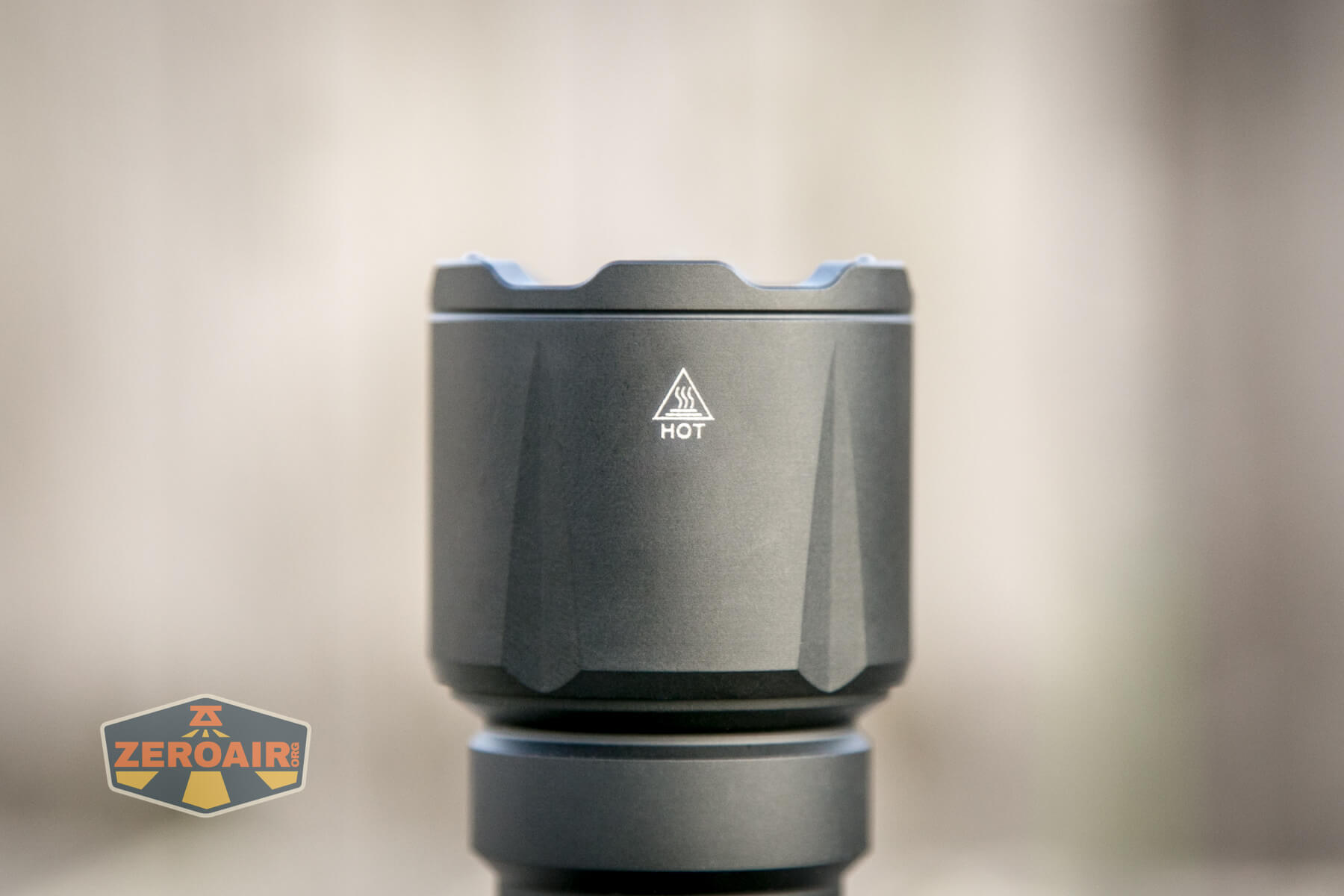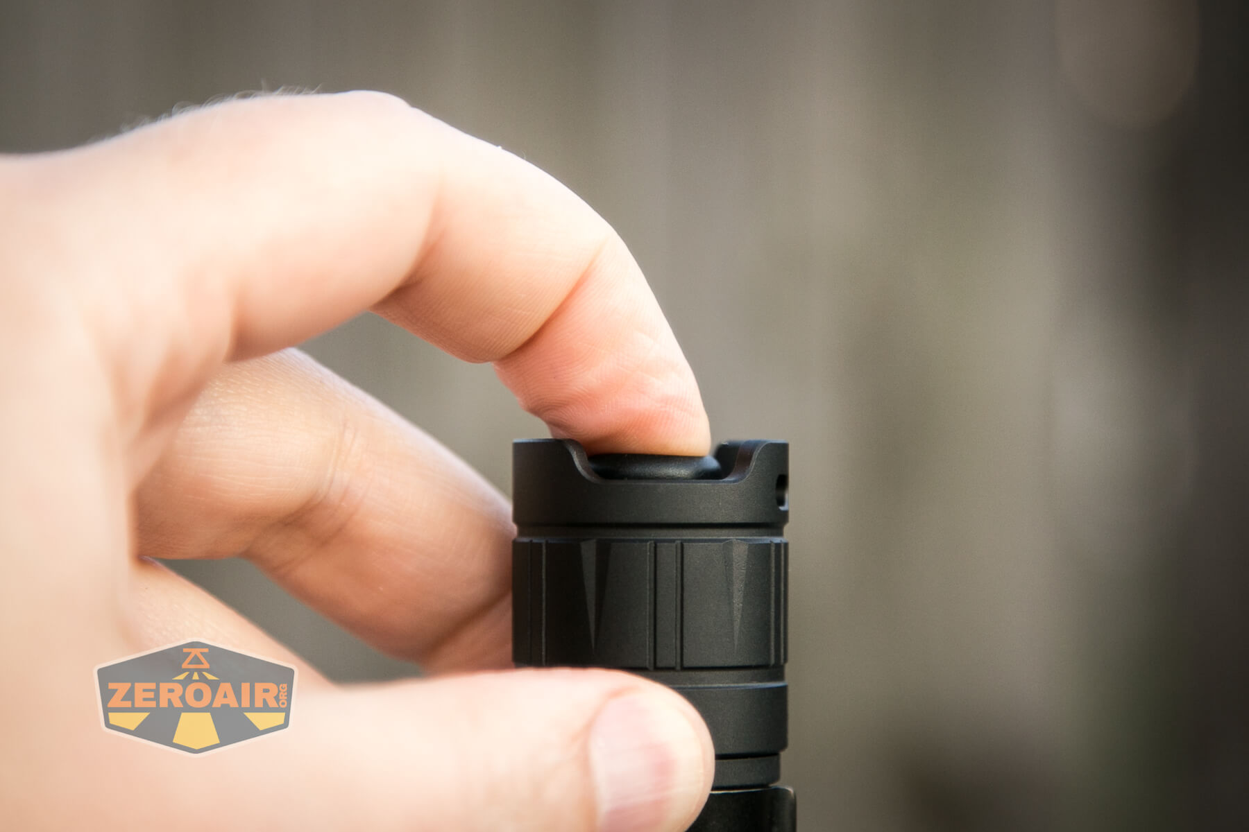 The second option for operation is the e-switch on the side near the head. This switch is metal(ish?) and very proud. Also, it doesn’t compete with anything else, so it’s very easy to find without looking. Notably this switch (cover) is improved from lights like the H3, which is otherwise a very similar flashlight.
