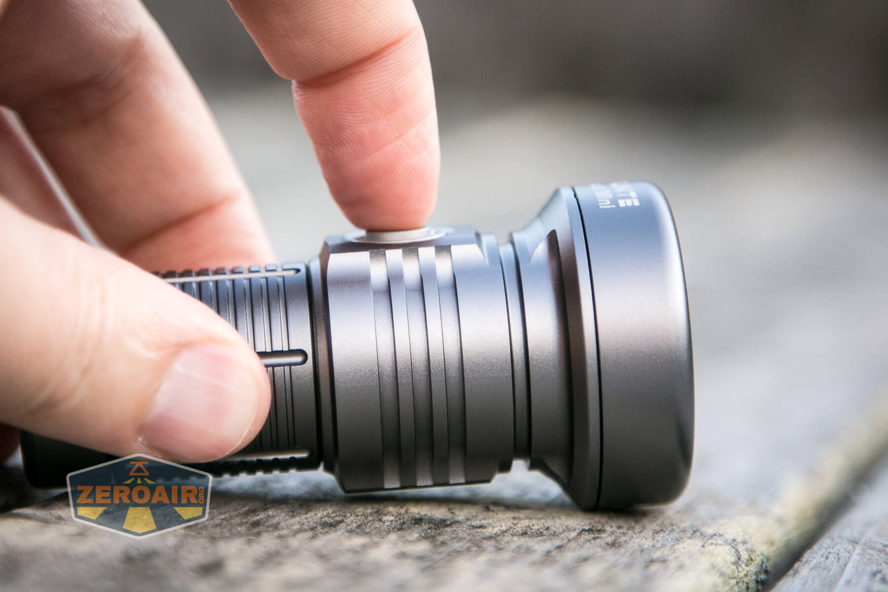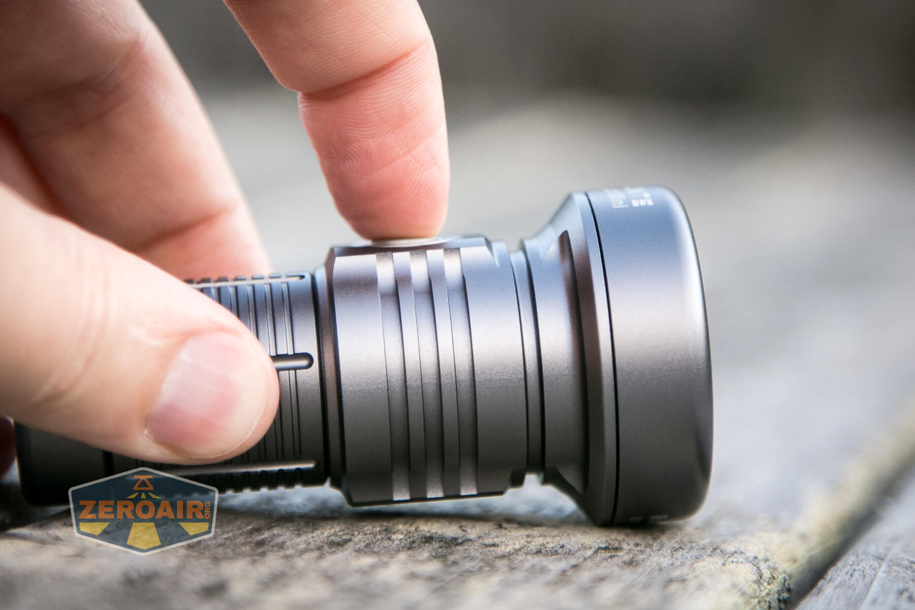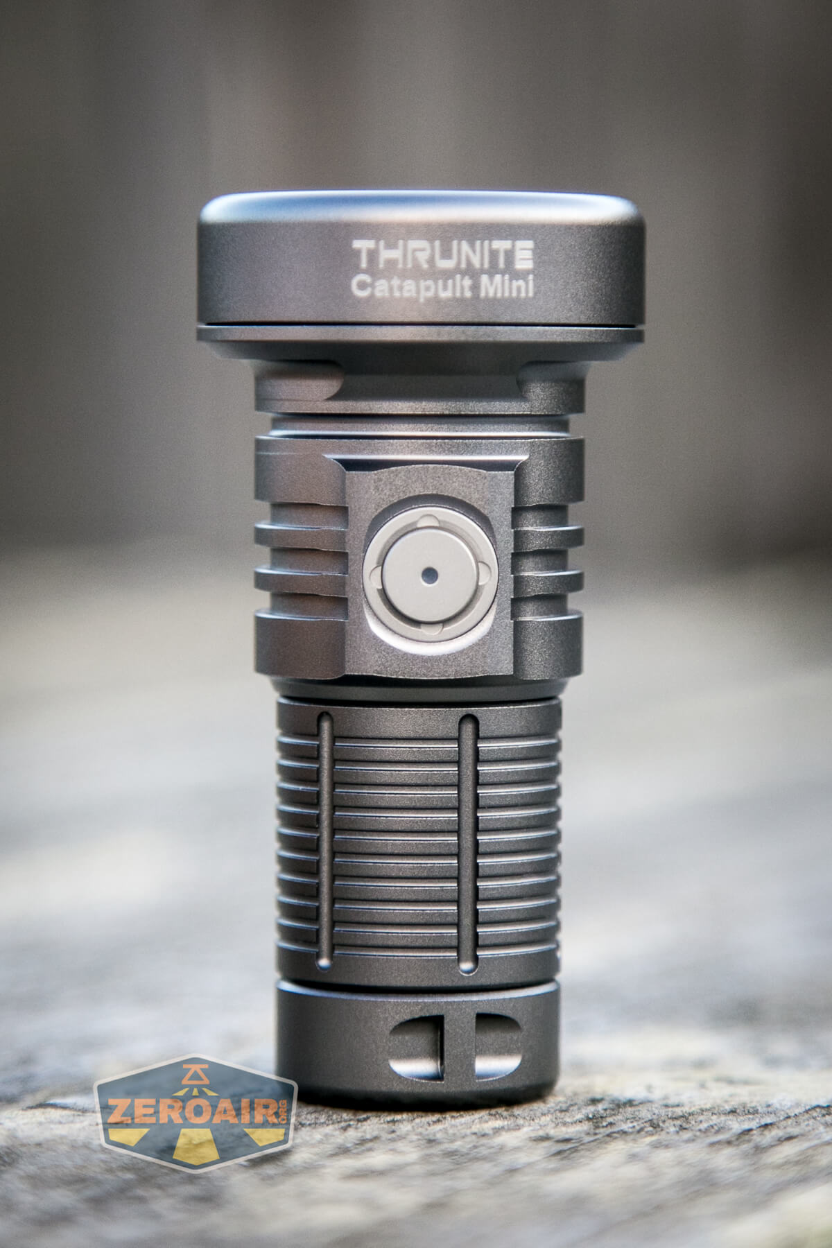 Thrunite put a single switch in the Catapult Mini. It’s an indicating e-switch on the head, and just slightly proud. The cover is hard (but probably plastic, not metal) – still a great switch. It’s easy to differentiate between the switch and the charge port cover.