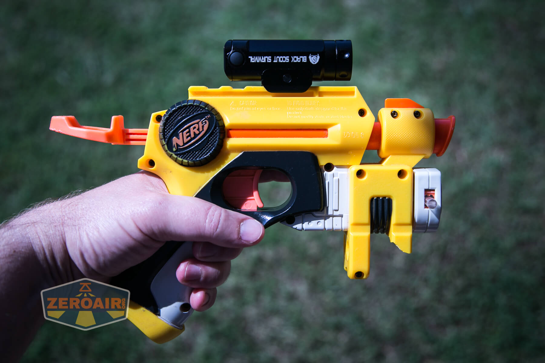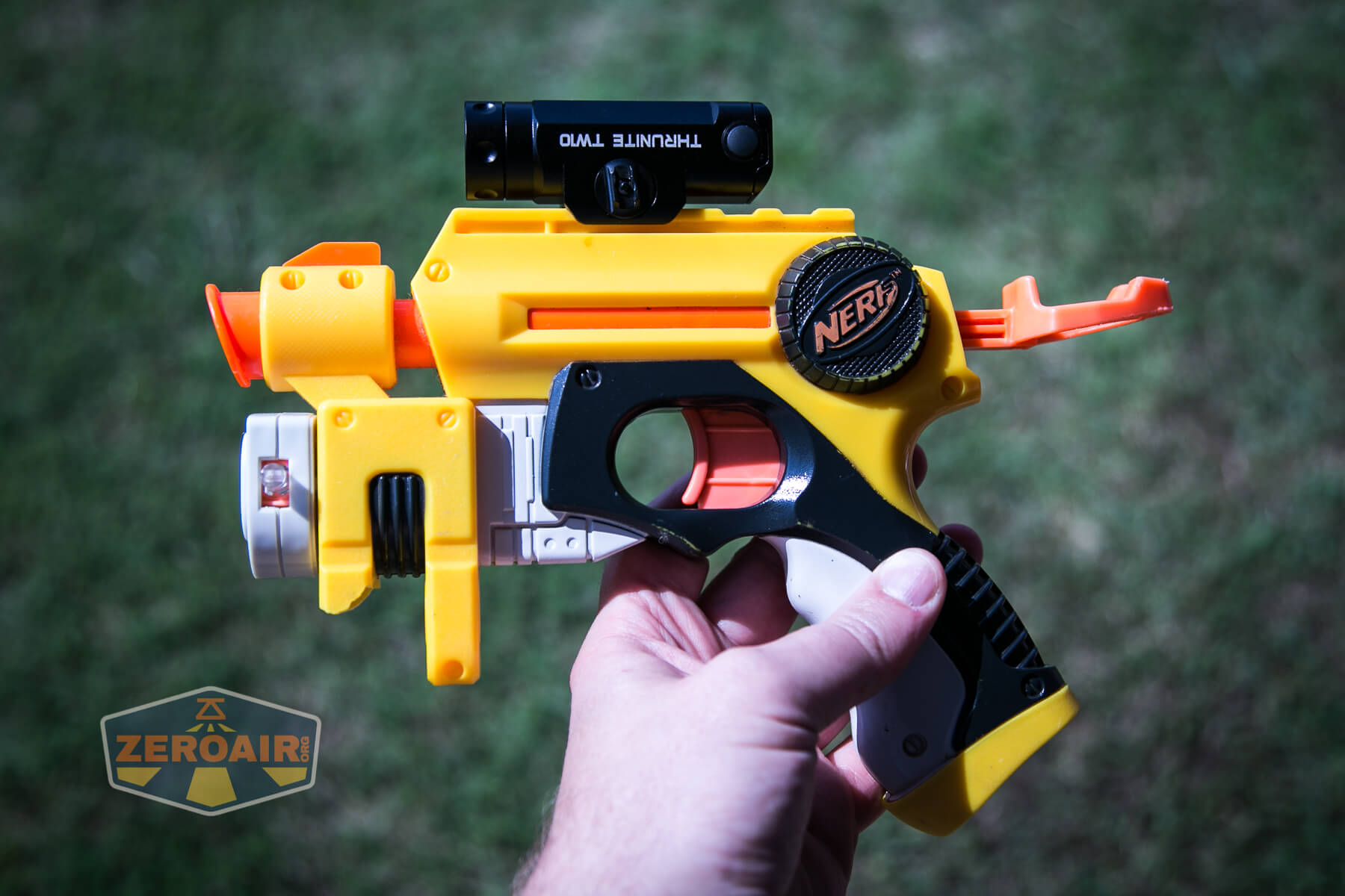 Something that positively chaps my hide is that Nerf rails are not standard dimensions. So while this Thrunite TW10 flashlight looks mounted, it’s not really mounted well. (Again, not that you’d really mount this way on any gun.) I really wish Nerf rails were standard rails!!