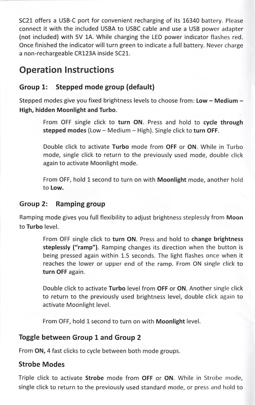 Group 2 (Ramping) is very similar to the above Group 1, except holding the switch will cause the light to ramp up. Loosening then holding the switch again within 1.5s will cause the ramp to switch directions. So it’s possible to ramp up or down. Double click still gets Turbo.