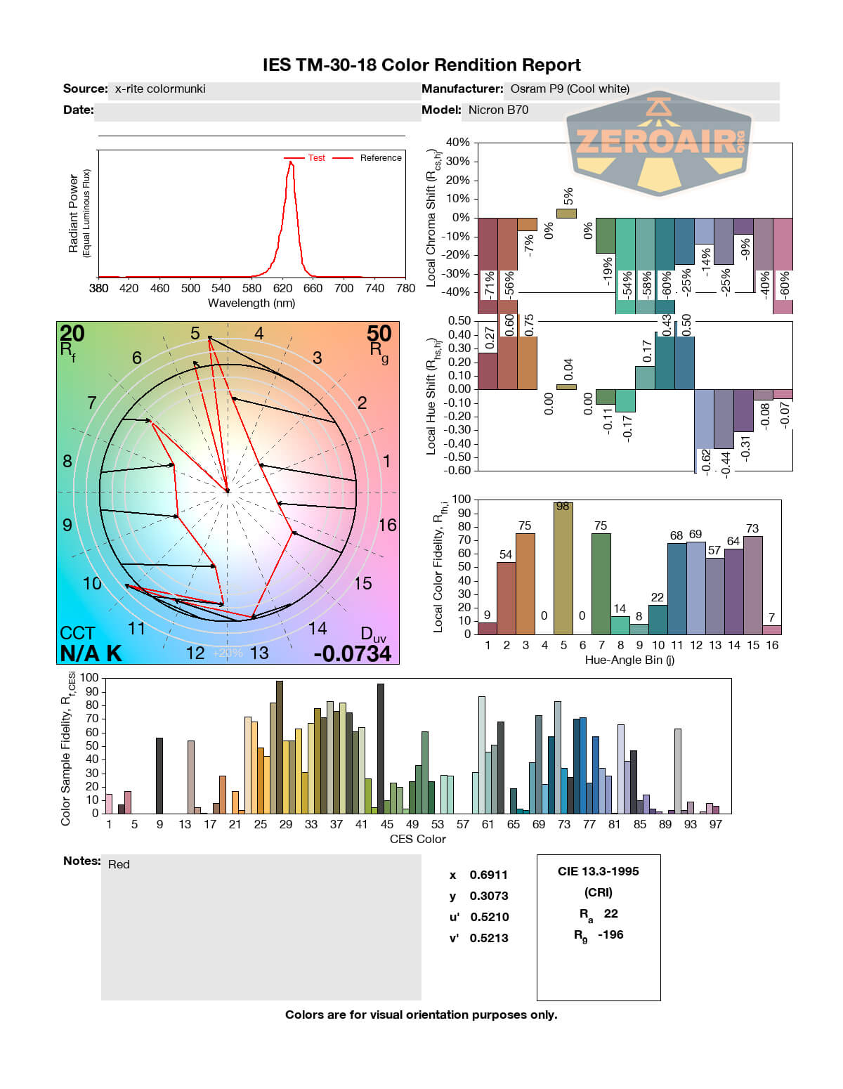 I was unable to find that in the documentation, but Nicron told me it’s Osram P9. I was also unable to find the Kelvin claimed, but it’s cool white.