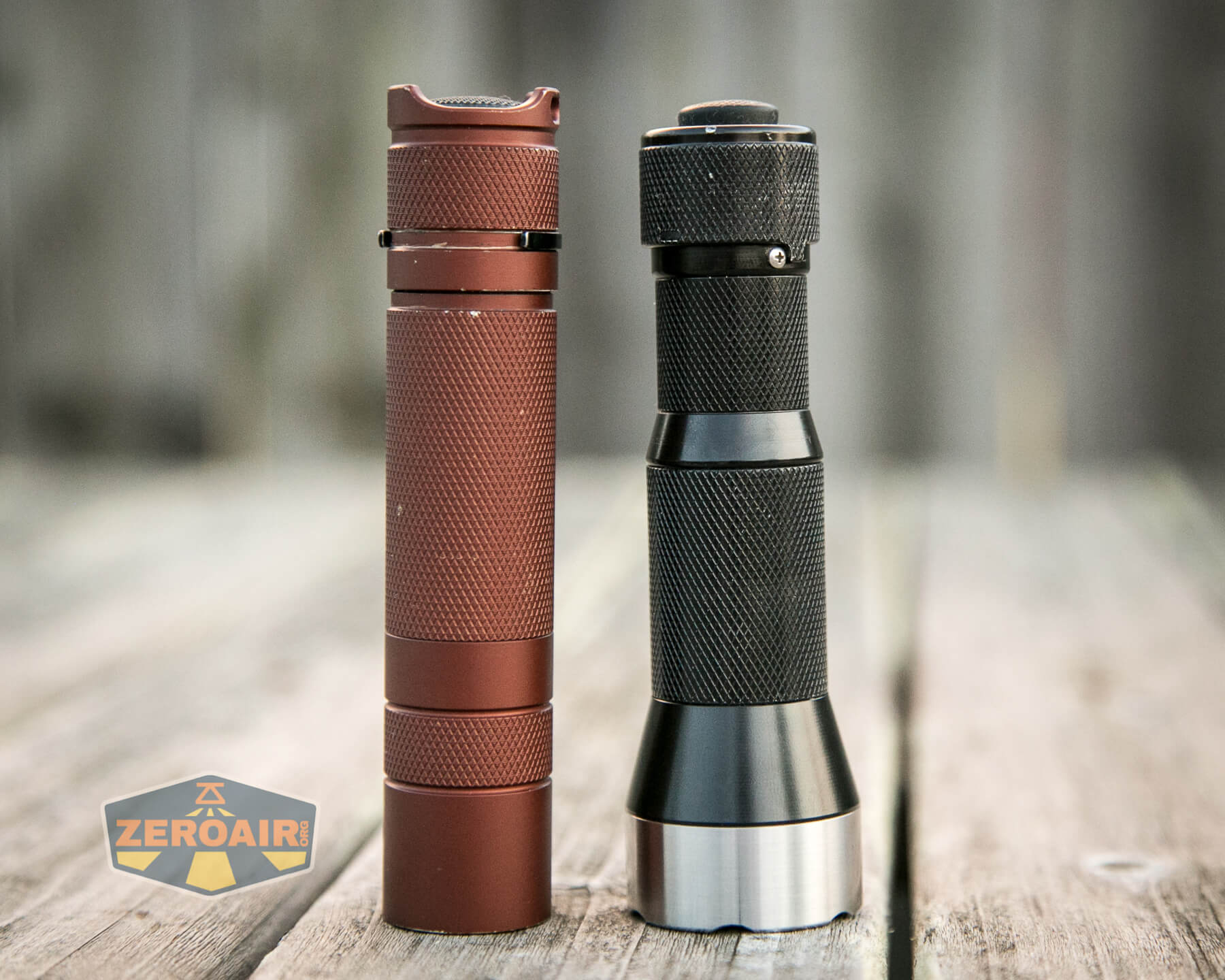 And here’s the light beside my custom-engraved TorchLAB BOSS 35, an 18350 light. I reviewed the aluminum version of that light in both 35 and 70 formats.