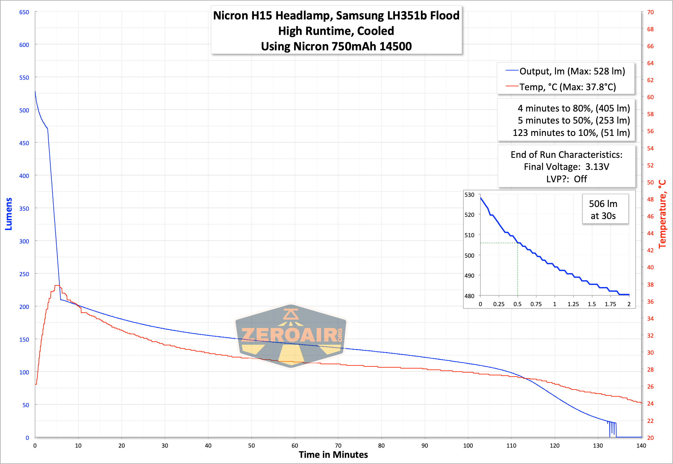 | Measured Lumens (at 30s) | 506 (126.5% of claim)^ |