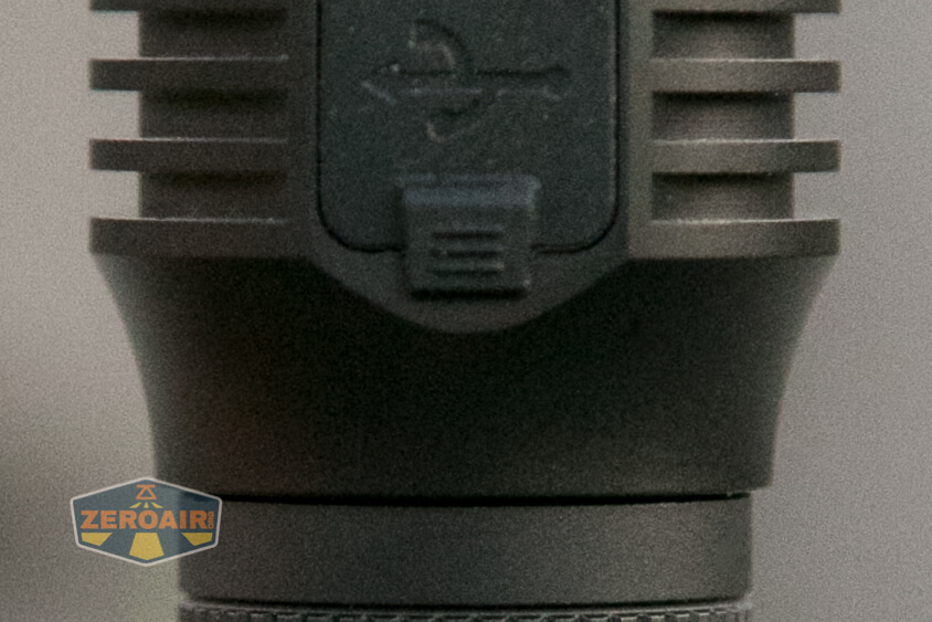 On the Lumintop D2 thrower flashlight is built-in charging. It’s by a USB-C port in the head, opposite the switch. This is one difference from the original B01, which had micro-USB. The newer B01 (and the one you’d receive if you purchased now) has USB-C too (just like this D2!) The update is welcome!