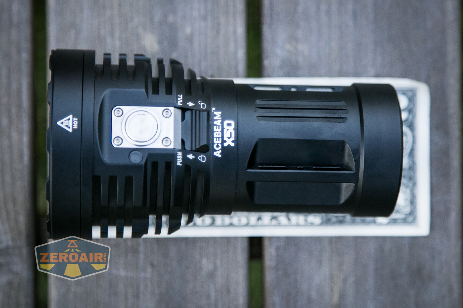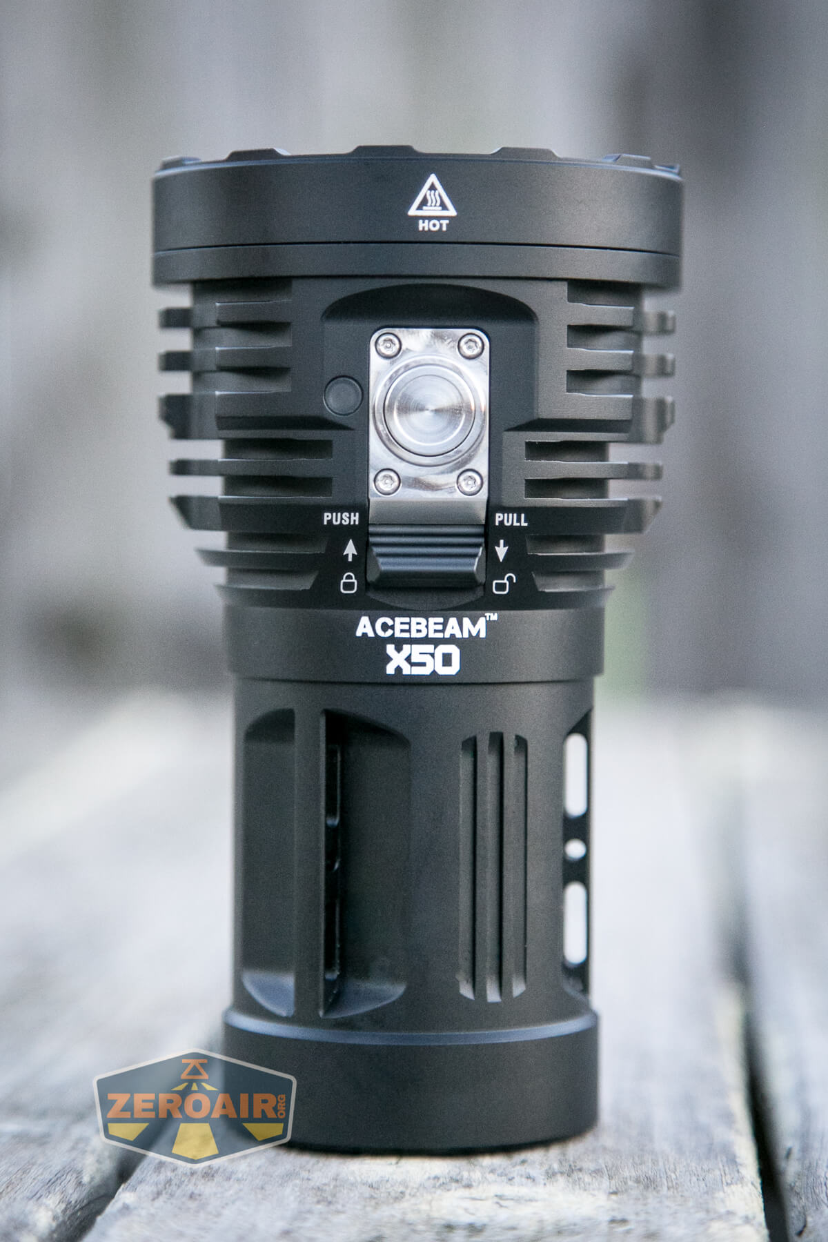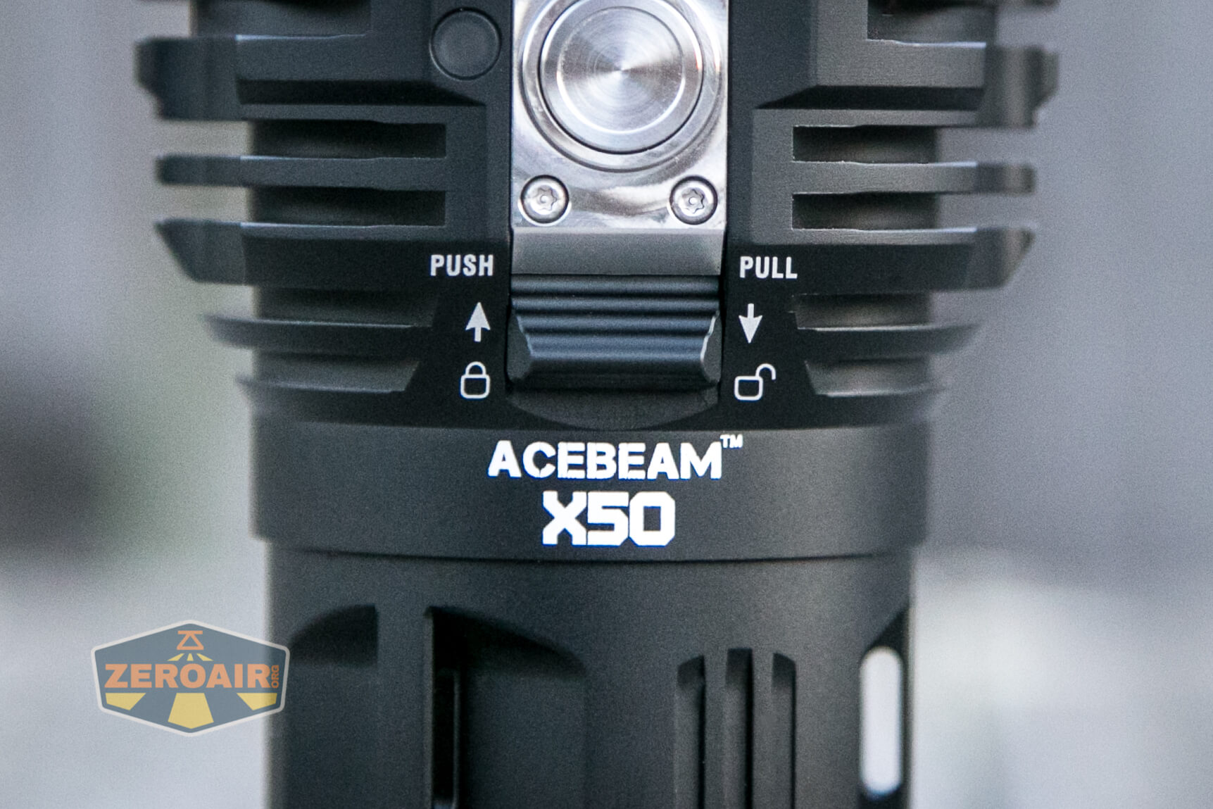 Another extremely important aspect of operation for the Acebeam X50 Searchlight is this second switch. It’s possible to physically lock out the X50 using that physical toggle switch seen below (just above the logo.) In the “up” position, the e-switch can not be pressed. It’s physically blocked. I would guess that this physical block on the e-switch does not affect any quiescent current that might be present in the system, so if you want a lockout that breaks the electrical connection, you’ll want to loosen the body ever so slightly, too.