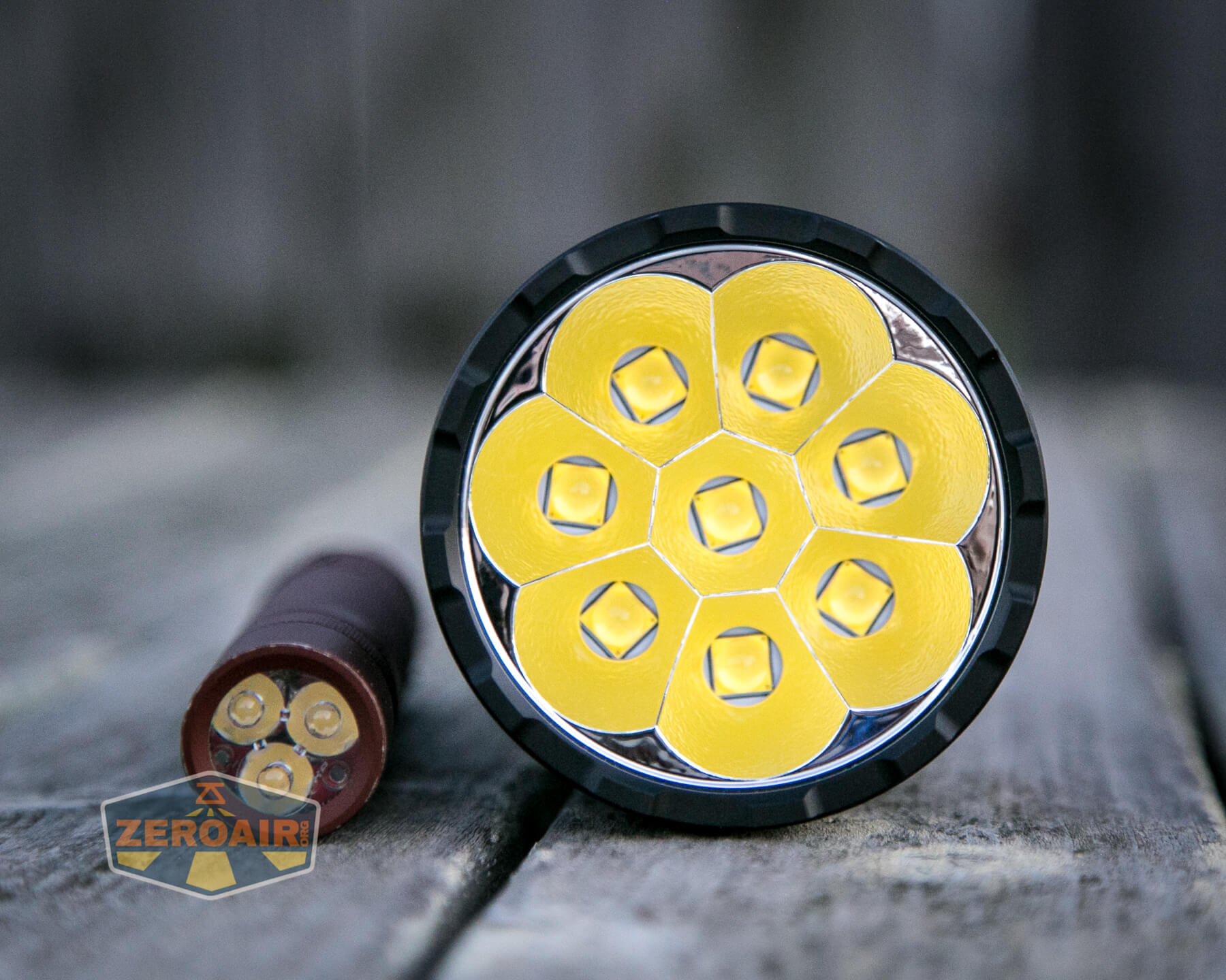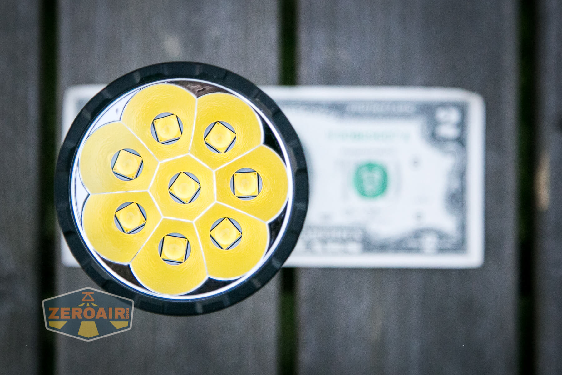 In the Acebeam X50 Searchlight are eight (8) Cree XHP70.2 emitters. Two CCT’s are available – 6500K (CW) and 5000K. I picked the 5000K because I prefer the warmer option. The cooler option will have a higher output and more throw. But at something like 5% difference, you’re extremely unlikely to notice the difference in output or throw levels but you will certainly notice the difference in CCT between 6500K and 5000K.