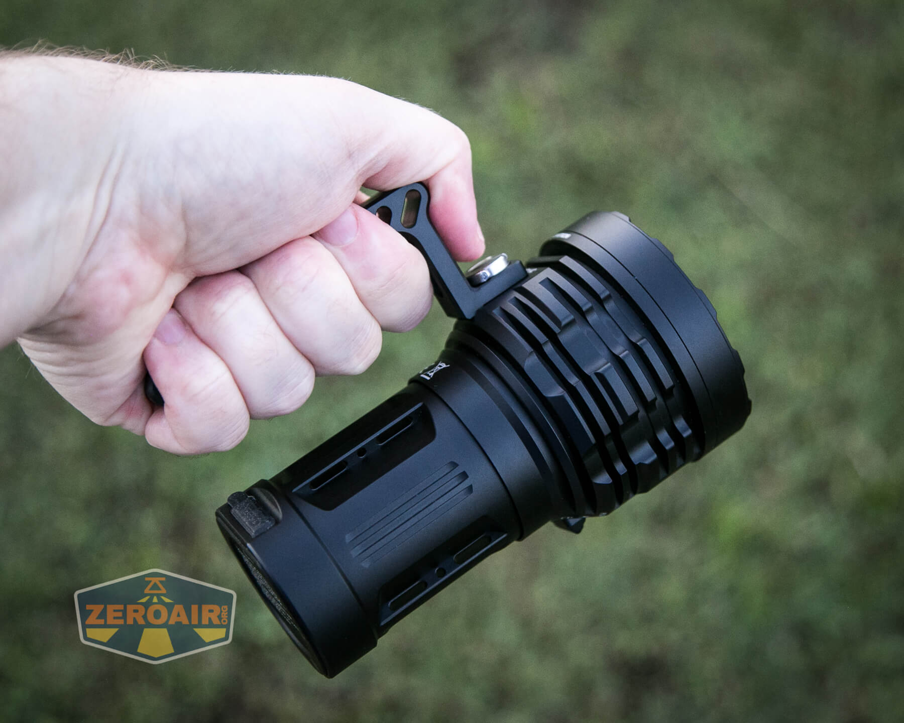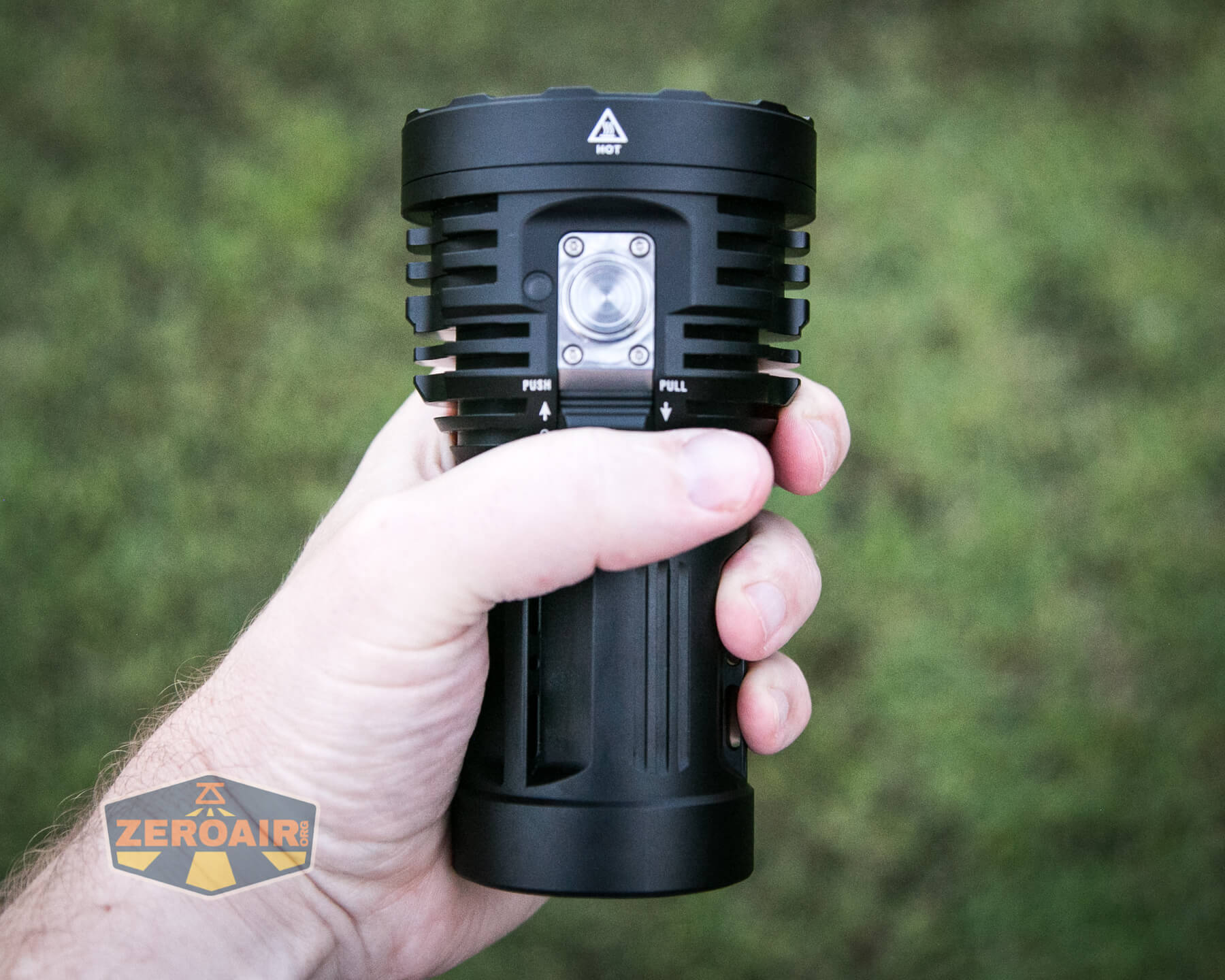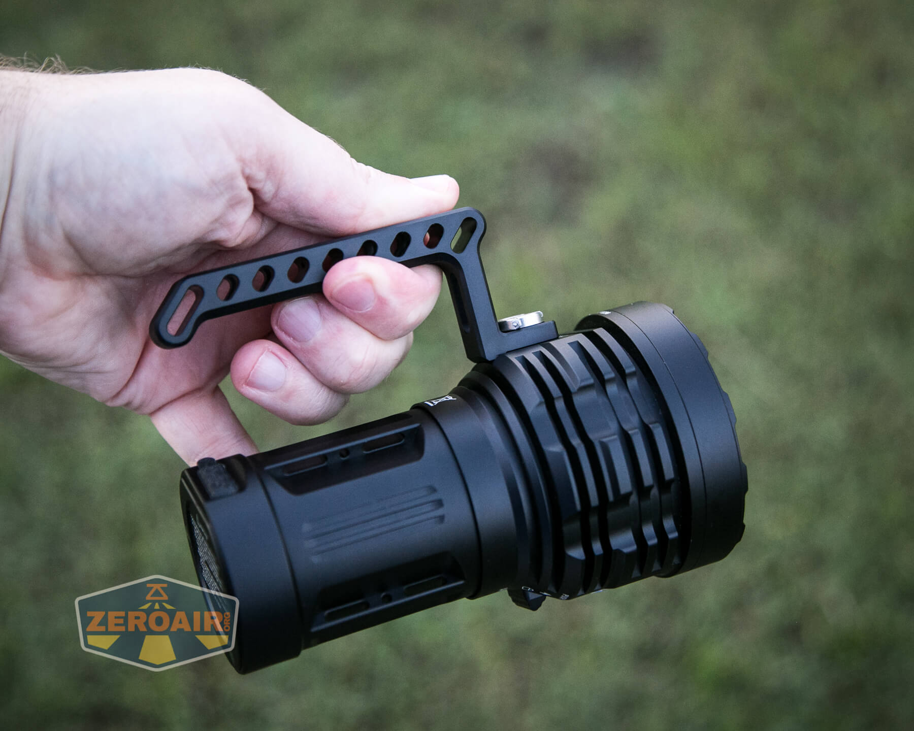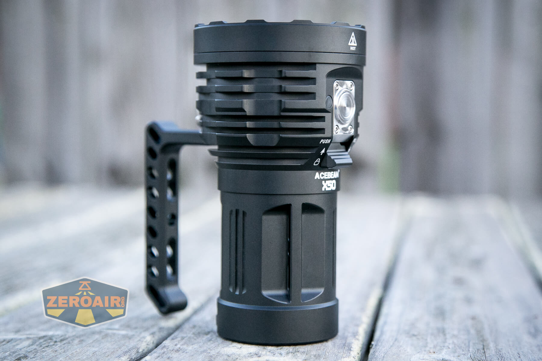 Here’s the downside of a “dumb handle.” Dumb meaning, of course, no electronics. The switch is on the opposite side from the handle. That’s just the facts, but essentially means two hands will be required for operating the Acebeam X50 Searchlight when also using the handle.