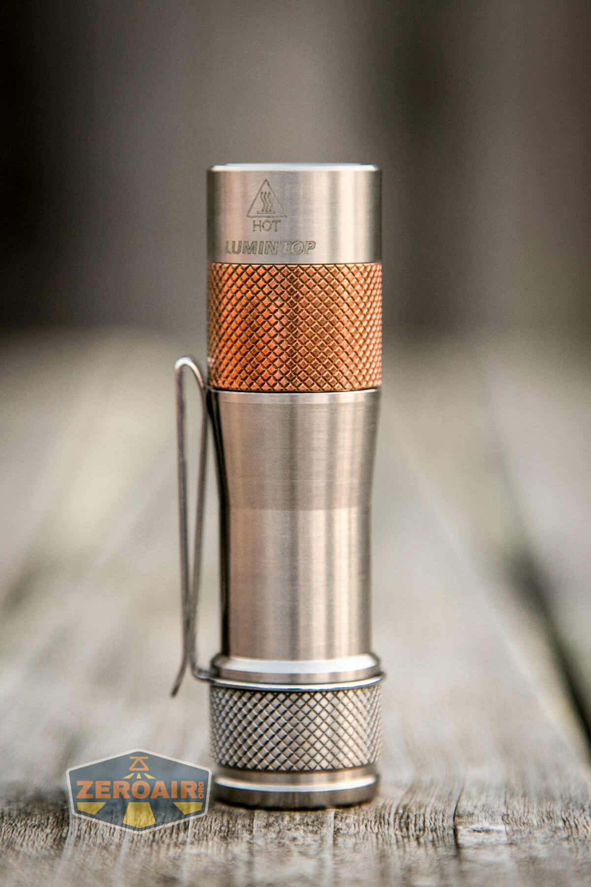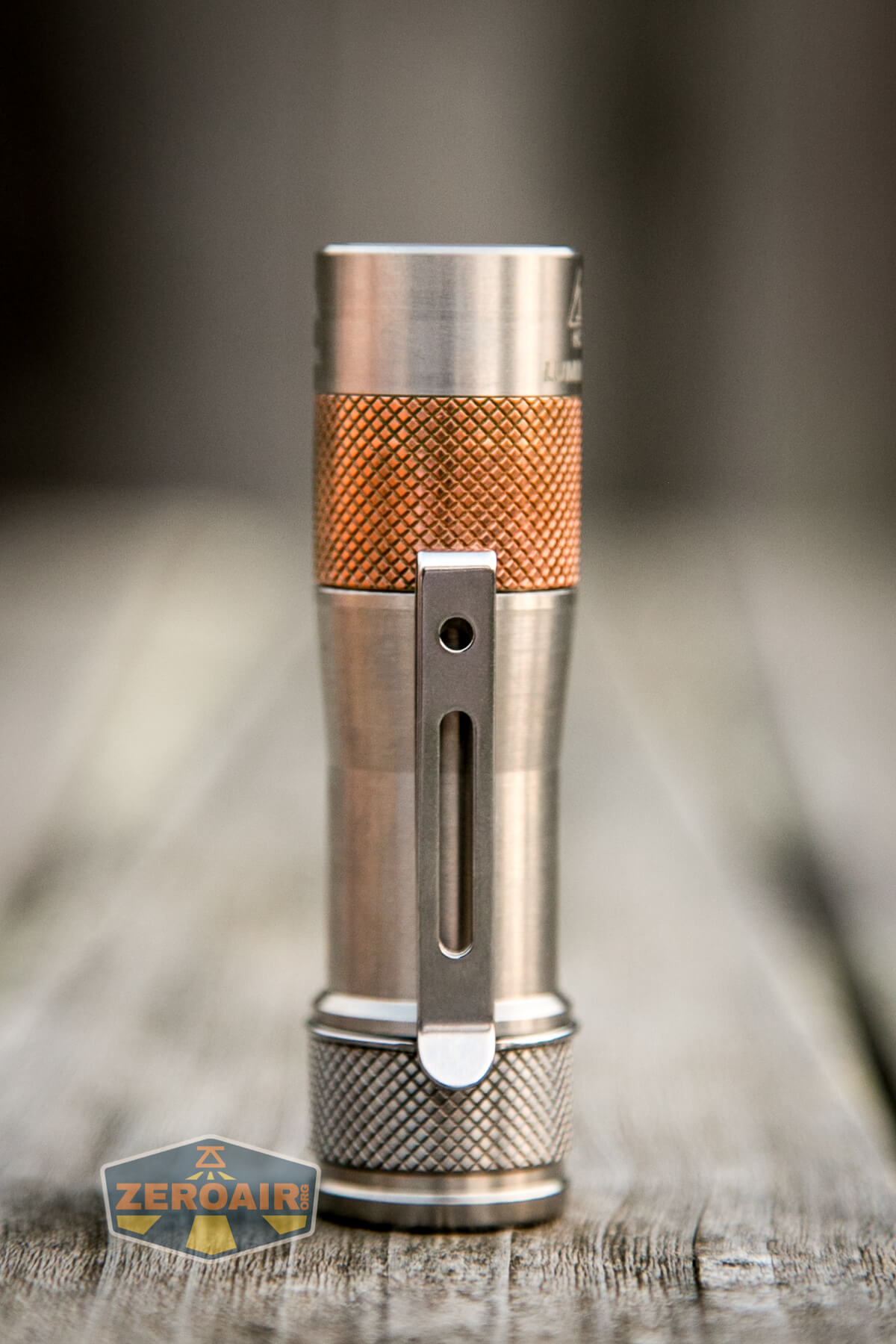 Unlike my first FWAA, on the Lumintop FWAA TiCU 14500 flashlight version, the pocket clip shipped installed. It’s a two-way pocket clip. This replaces the tactical ring, and the two can’t be used concurrently.