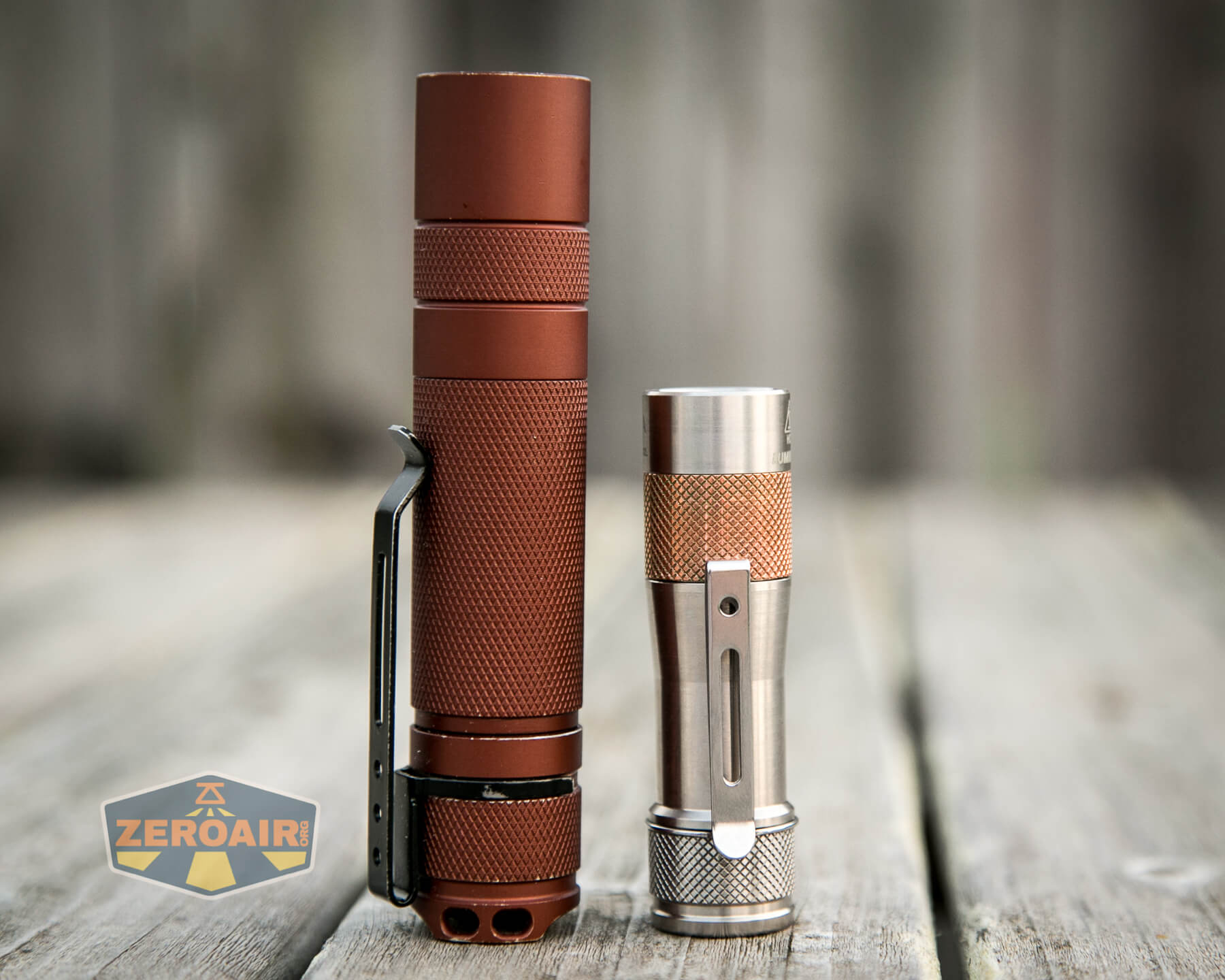 And here’s the light beside my custom-engraved TorchLAB BOSS 35, an 18350 light. I reviewed the aluminum version of that light in both 35 and 70 formats.