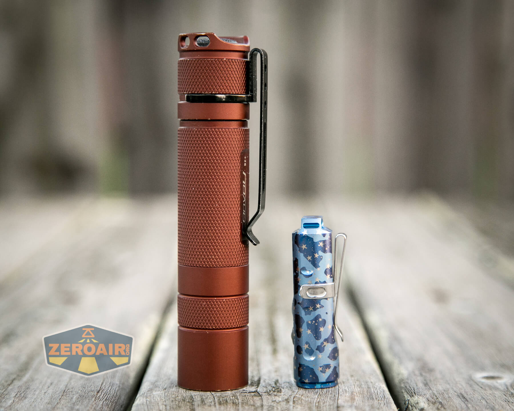 And here’s the light beside my custom-engraved TorchLAB BOSS 35, an 18350 light. I reviewed the aluminum version of that light in both 35 and 70 formats.