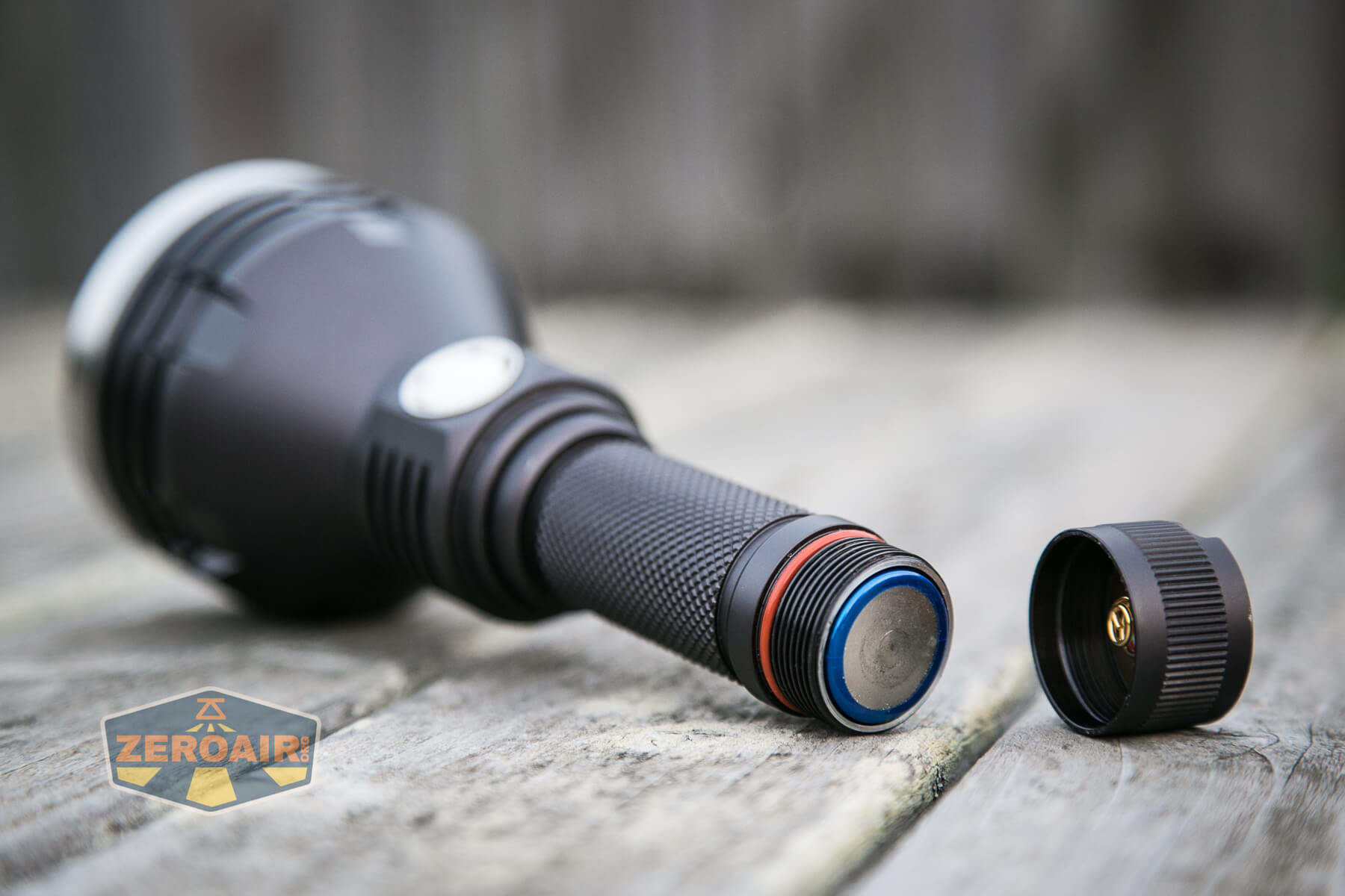 Removing the tailcap reveals anodized square-cut threads, with minimal lube. They’re quite long threads, so many twists are required. The tailcap has a spring, too.