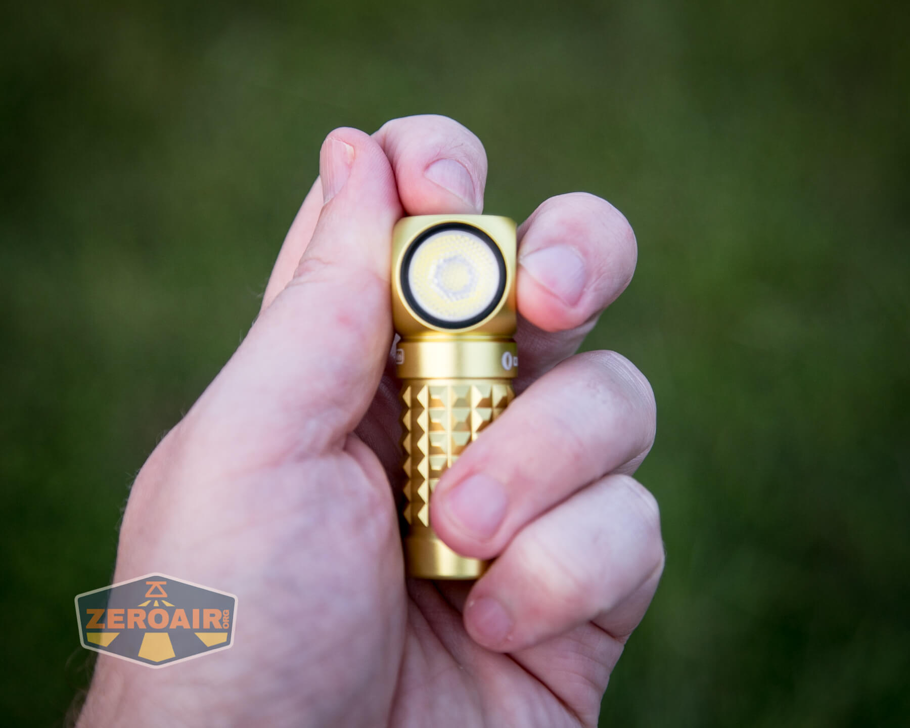 The Olight Perun Mini Kit Headlight uses a single e-switch on the head. It’s a big flat switch, and nice and soft. It is not the least bit proud, which allows the light to headstand. The Perun Mini is perfectly vertical when headstanding, too.