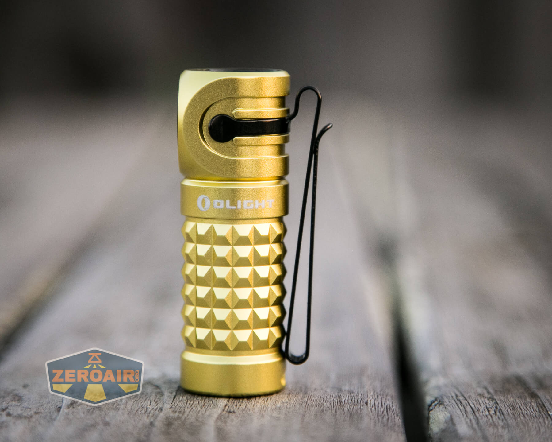 Since it ships attached to the light, let’s talk about the pocket clip first. It’s a black friction fit clip, which has the typical Olight connection. I like this because it means the light is in a reliable place in relation to the clip. Olight has added a little dot at the end of the arms to keep the clip from twisting off, too. Finally, the clip is a “both ways” clip, which I normally don’t like at all. The “primary” way to use the clip works well (that is, clipping with pants nearest the body of the light) but the second way is less ideal.