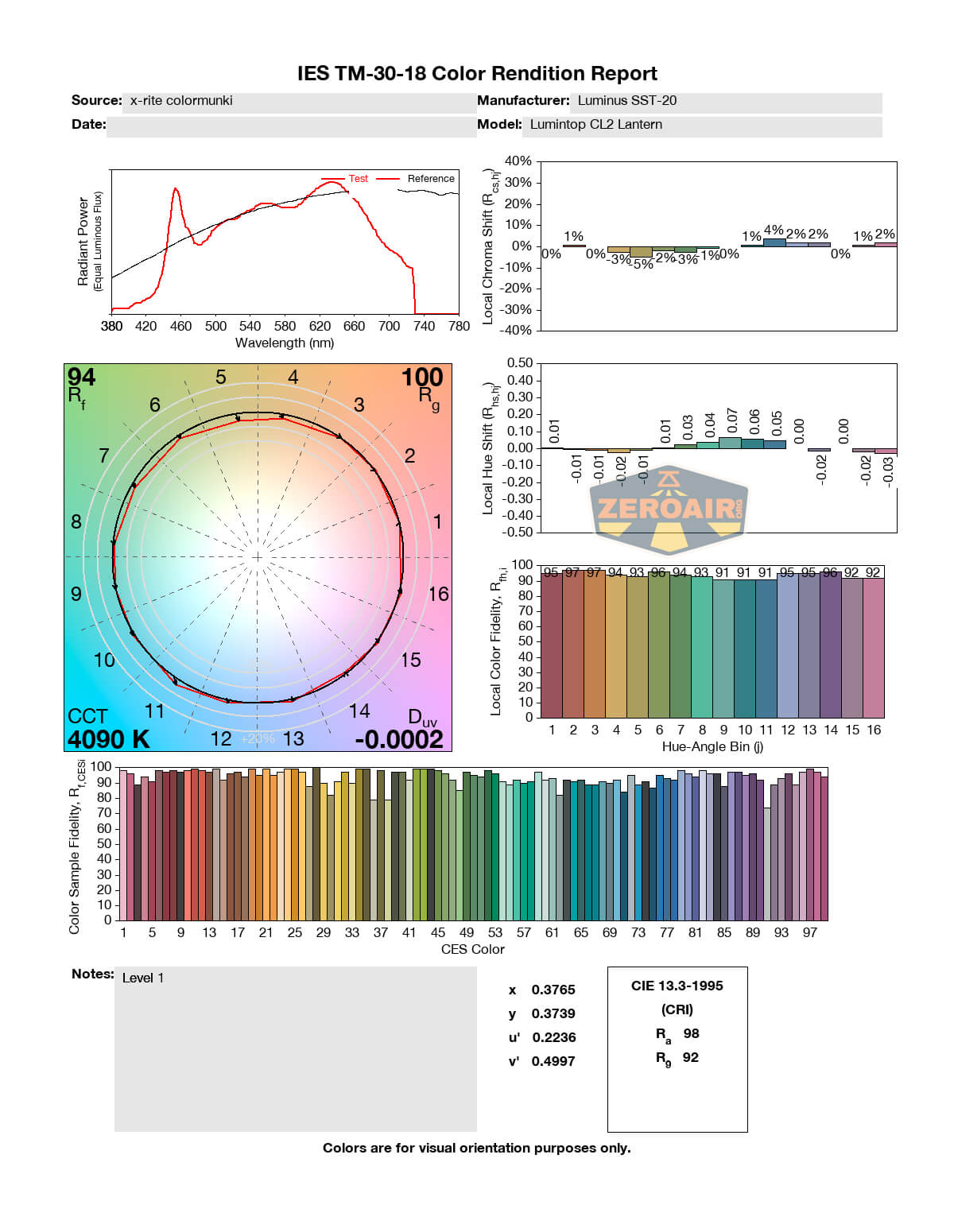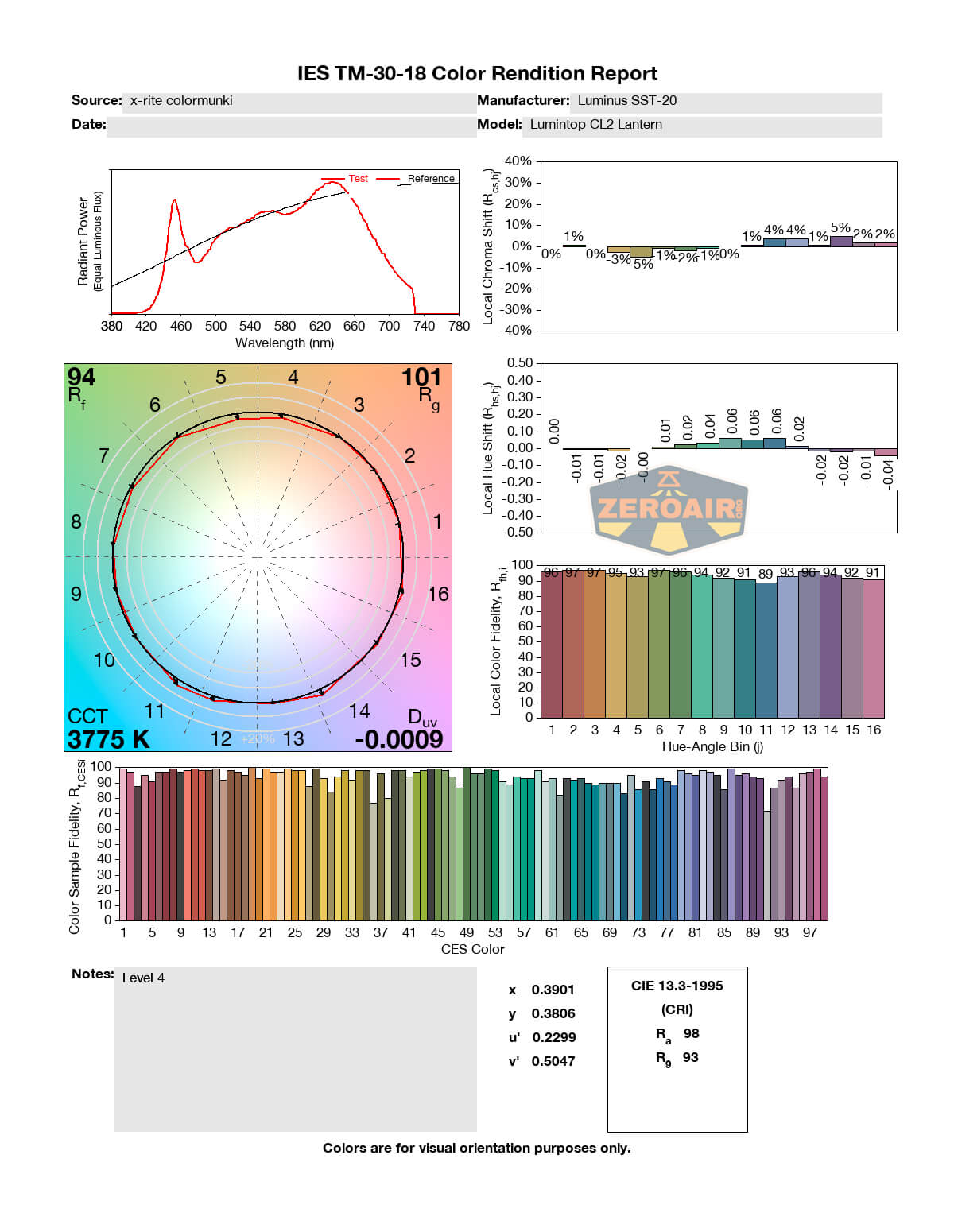 This is a great color report. Very high CRI, output near the black body line (but just under!) and under 4000K. This is very good.