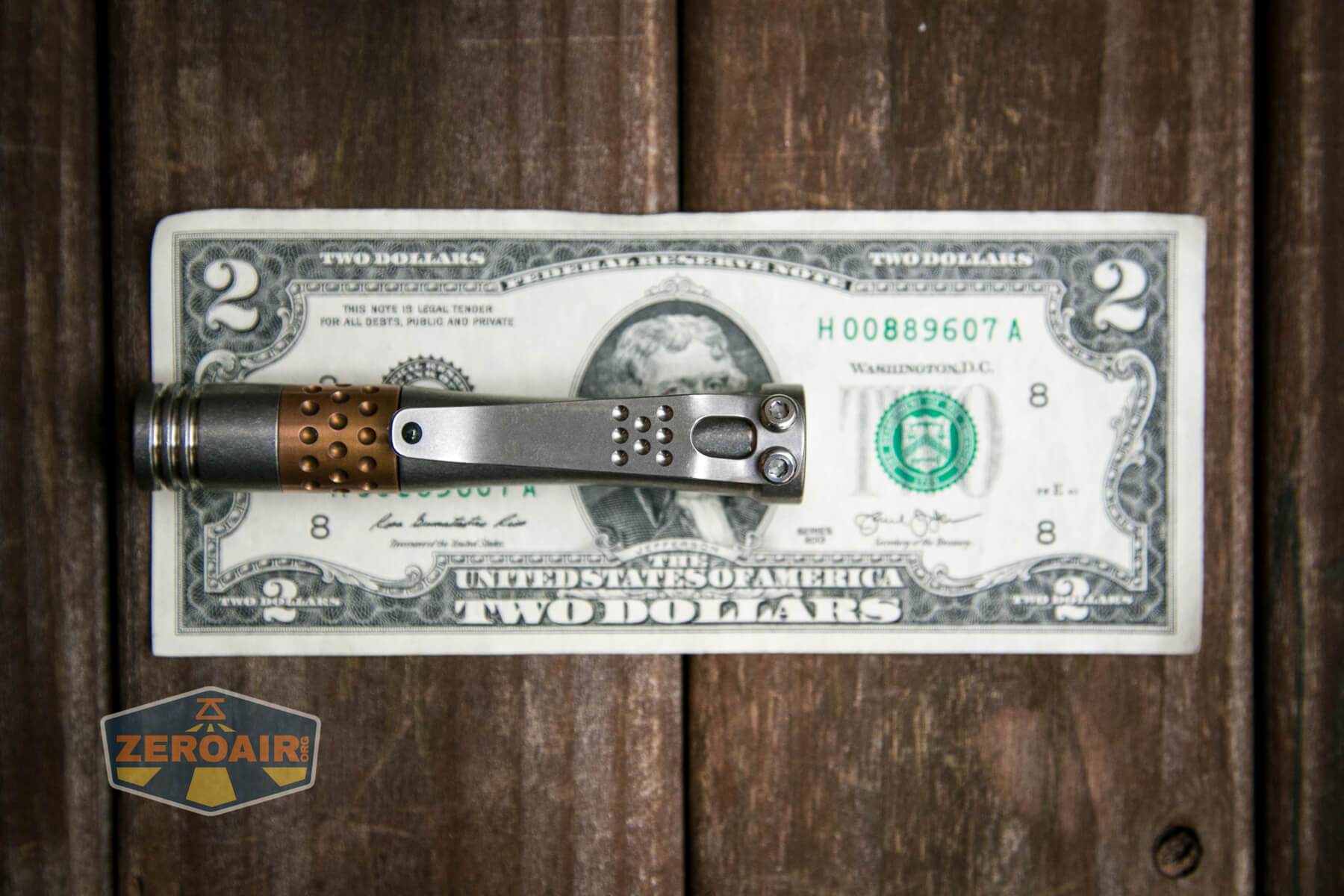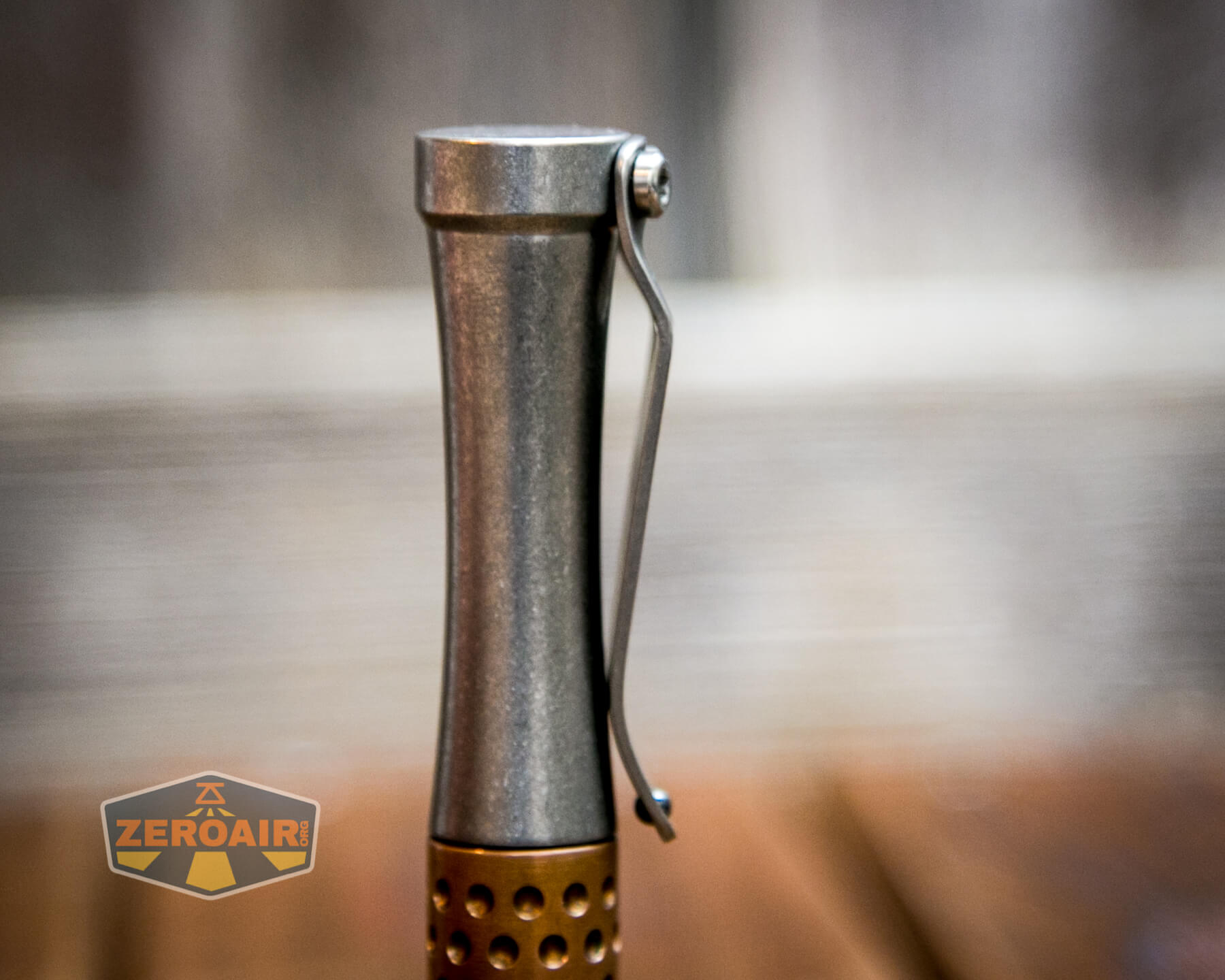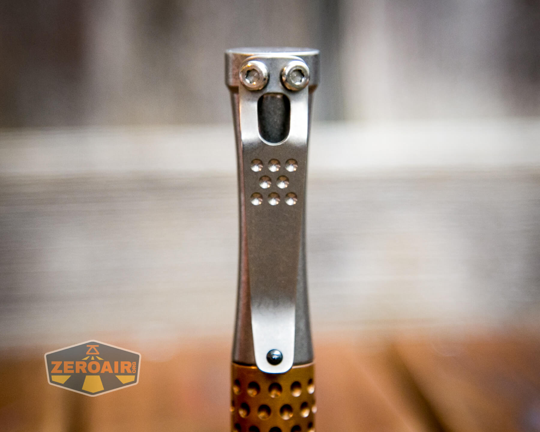 A pocket clip is provided with the Hoku. It has the signature dimples, which are echoed on the copper midsection.