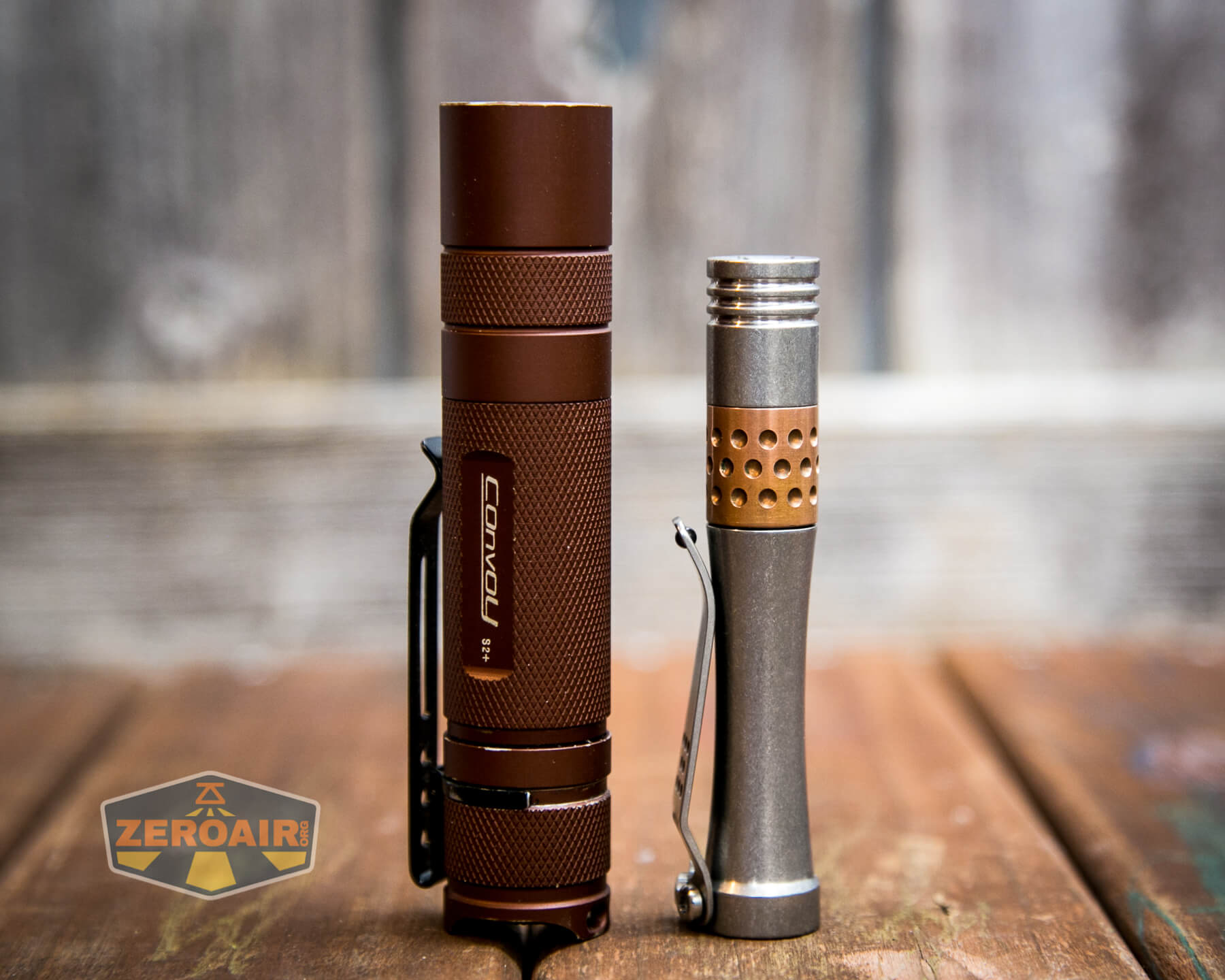And here’s the light beside my custom-engraved TorchLAB BOSS 35, an 18350 light. I reviewed the aluminum version of that light in both 35 and 70 formats.