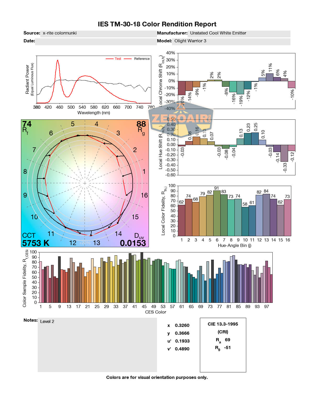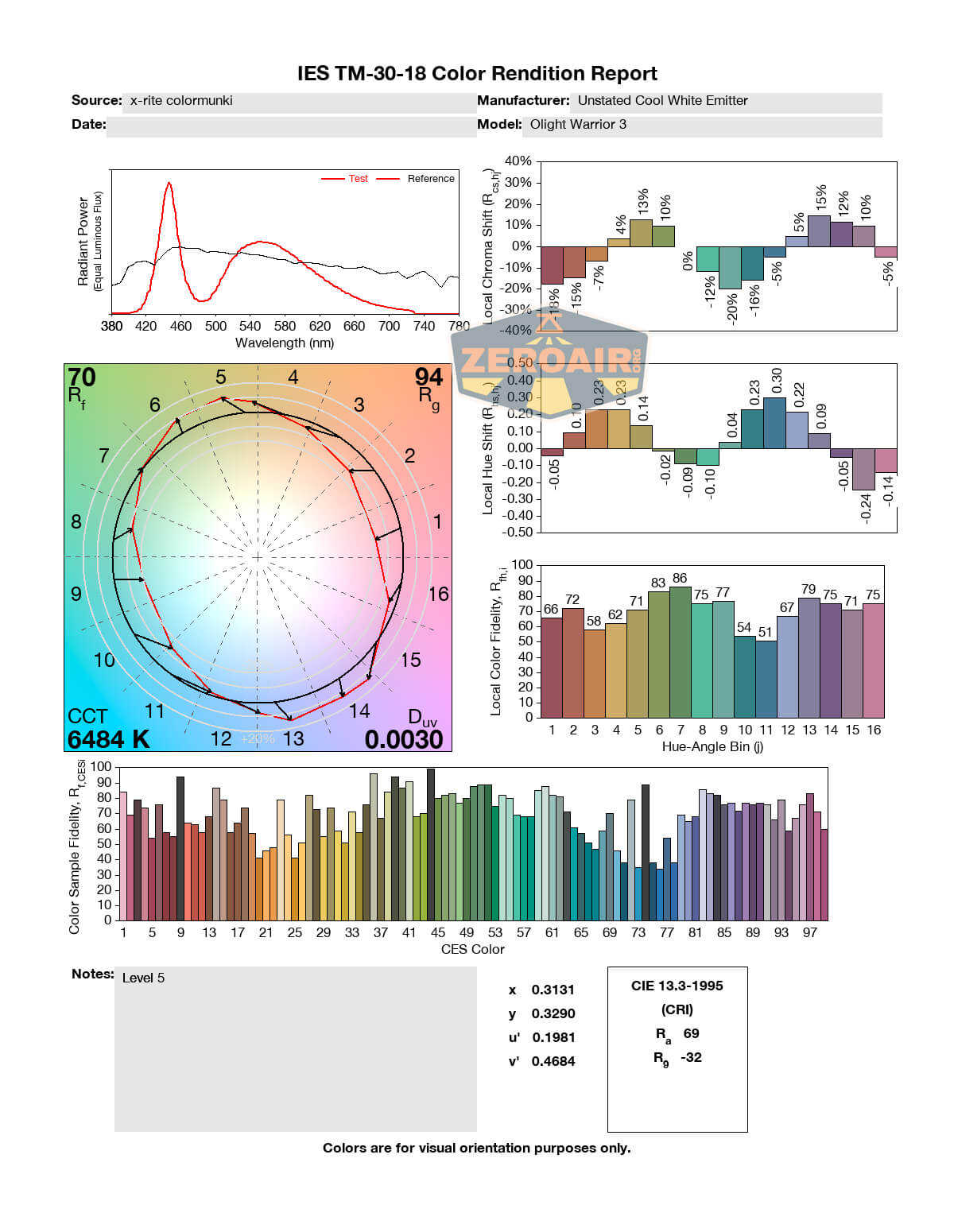 Here’s a CRI report for all modes, after an emitter warmup. What can we say about this? Well, it’s not as cool as I’d have guessed – under 6000K for all but Turbo. (No surprise that turbo turns cooler in the Kelvin range.) Another thing we can say is that it’s decidedly low CRI (around 70). And the third important point is “how are the reds” – the very negative R9 tells us this. And a final point is the Duv being positive (and really a “not small” positive number) indicates there’s enough green here that you’ll probably notice.