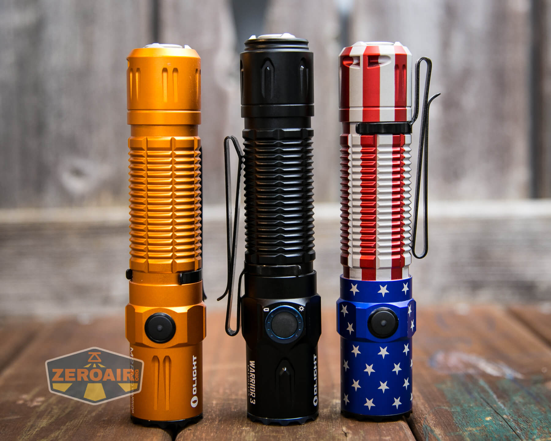 There are three Olight Warrior 3 flashlight versions. Black (seen here), Desert Camouflage, and Orange. Those last two are limited editions!