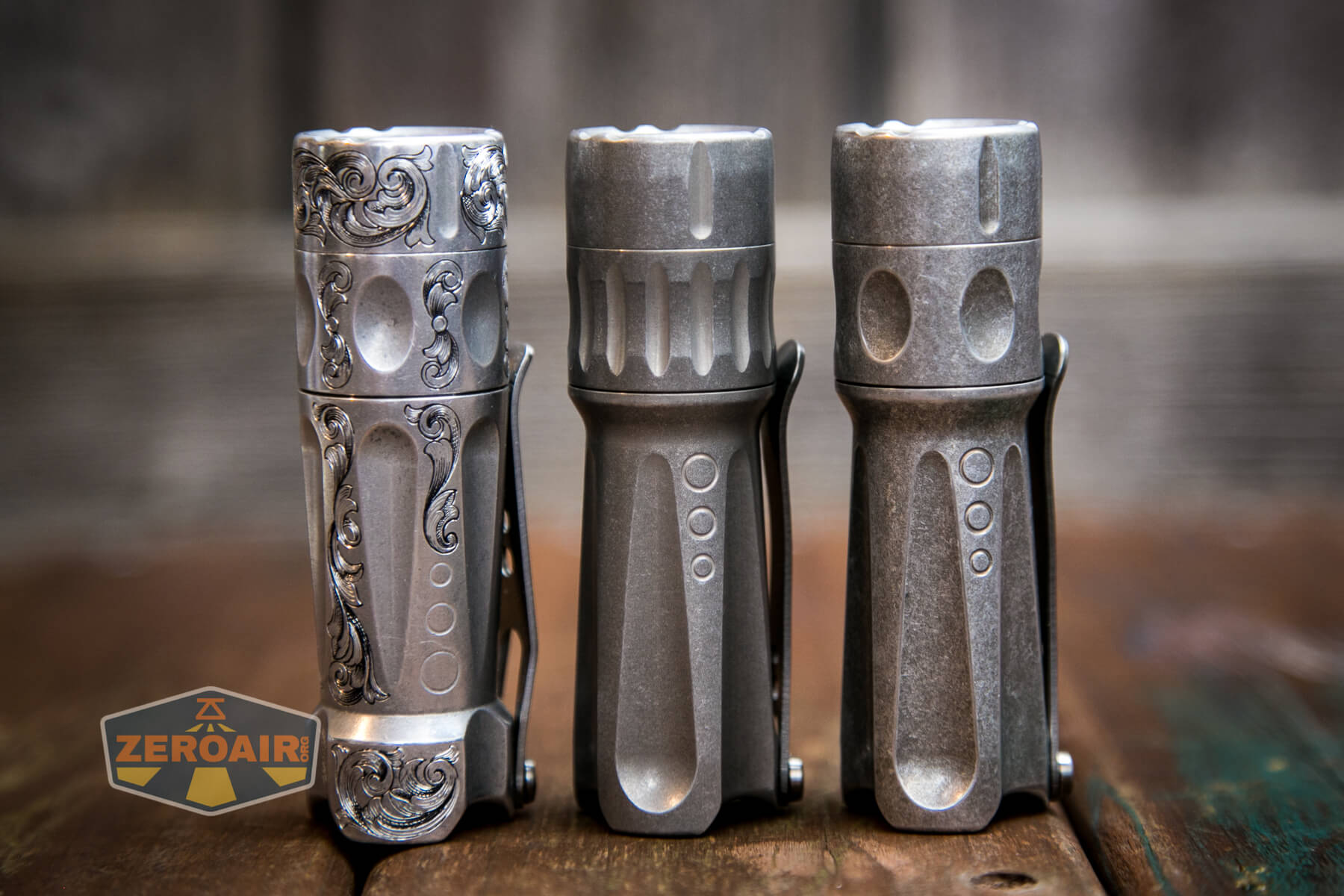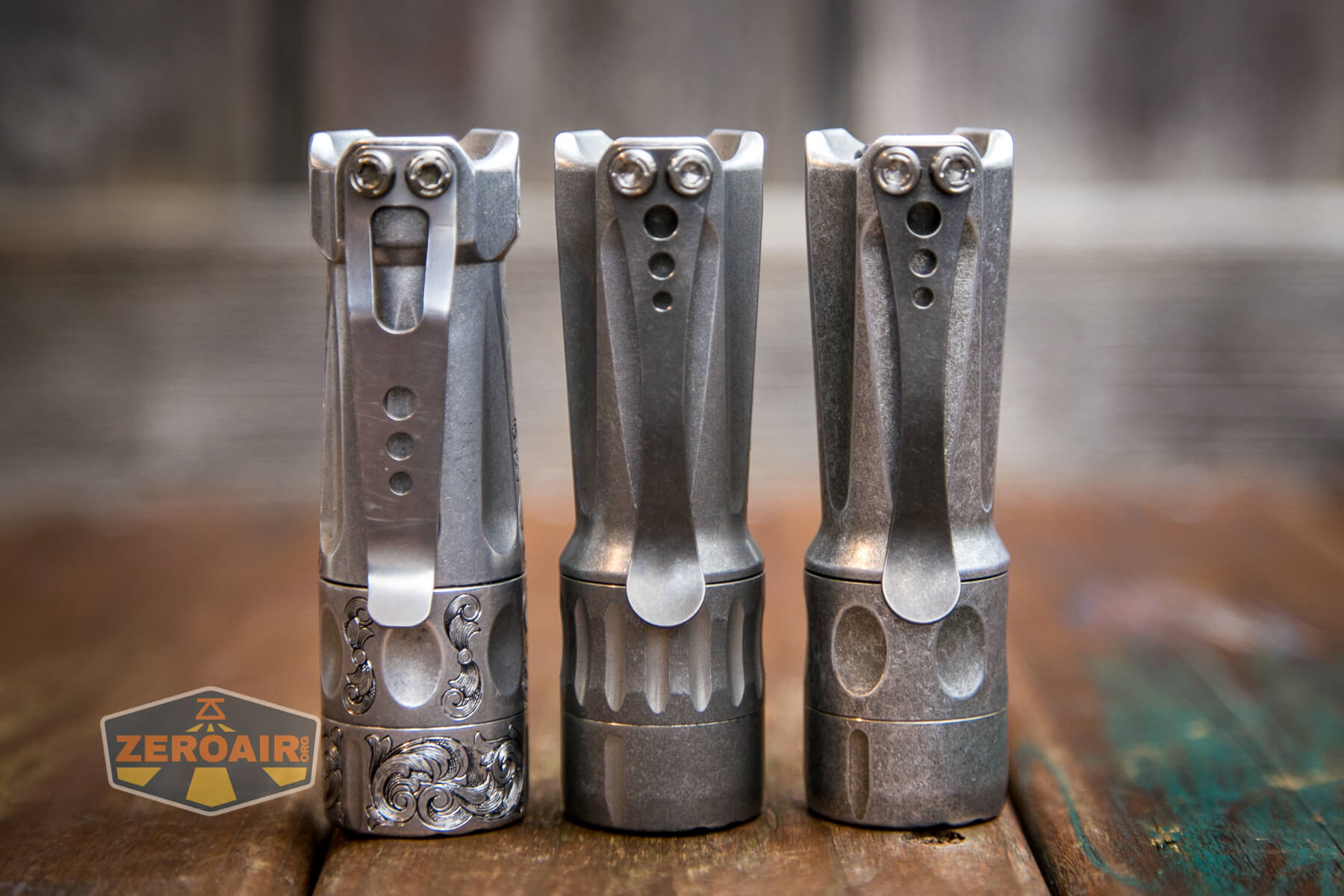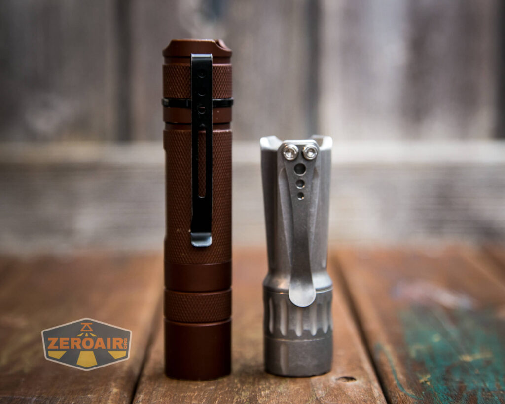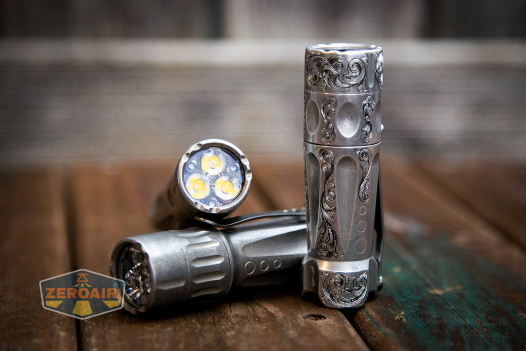 And here’s the TorchLAB Future BOSS with MOFF beside my custom engraved TorchLAB BOSS 35, an 18350 light. I reviewed the aluminum version of that light in both 35 and 70 formats.