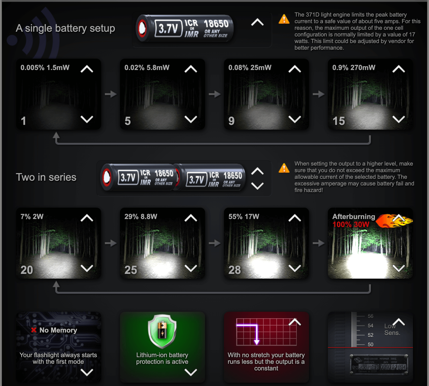 That’s right, a nine-page manual! A whole bunch of that is more geared to the 372 driver, which is different hardware than I’m covering here. Technically 371 v2.0 and 372 v2.0 have “identical firmware” (according to the manual), so practically everything you read in this review will also be useful knowledge for your TorchLAB BOSS 371 v2.0 firmware driver. There is one massive difference, however. The 372 v2.0 driver has compatibility with a maximum of one cell whereas the 371 v2.0 will work with two cells as well as one. But BOSS lights aren’t available with 372, so 372 isn’t the scope of this discussion.