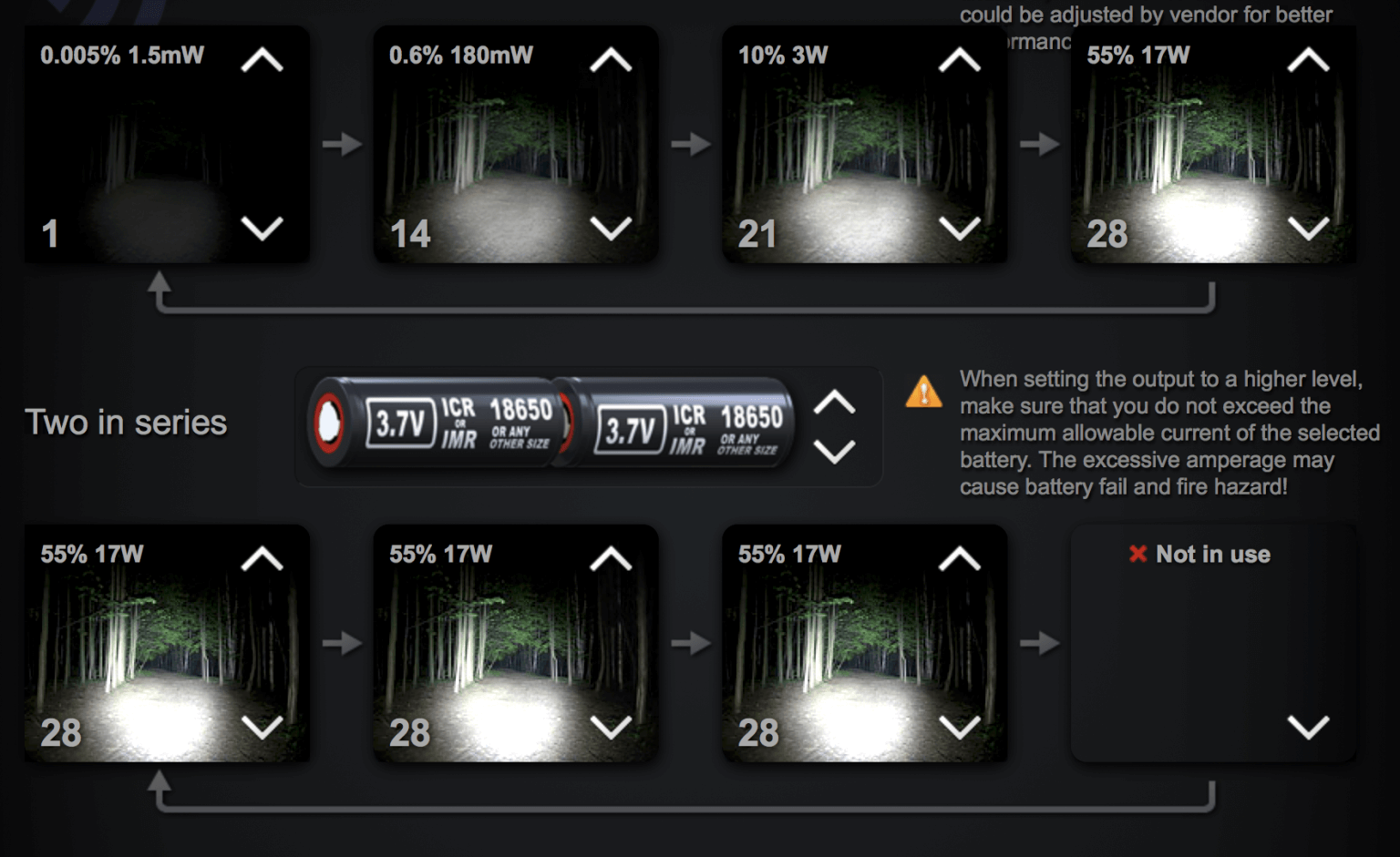 The below image demonstrates approximately the testing settings for most of the work I did on this light, including the runtime above. Despite having the light set to “Afterburner” the emitters are never seeing more than 21W of power anyway.
