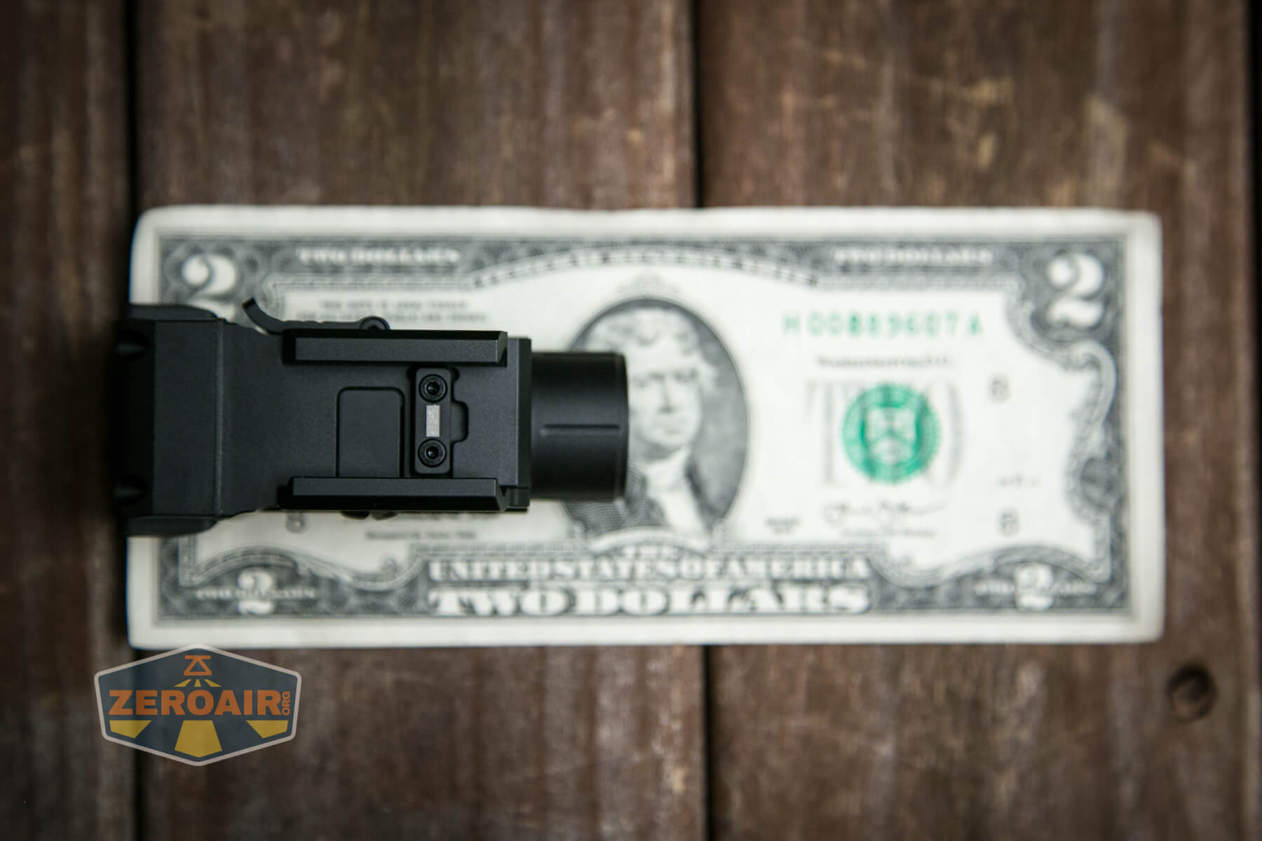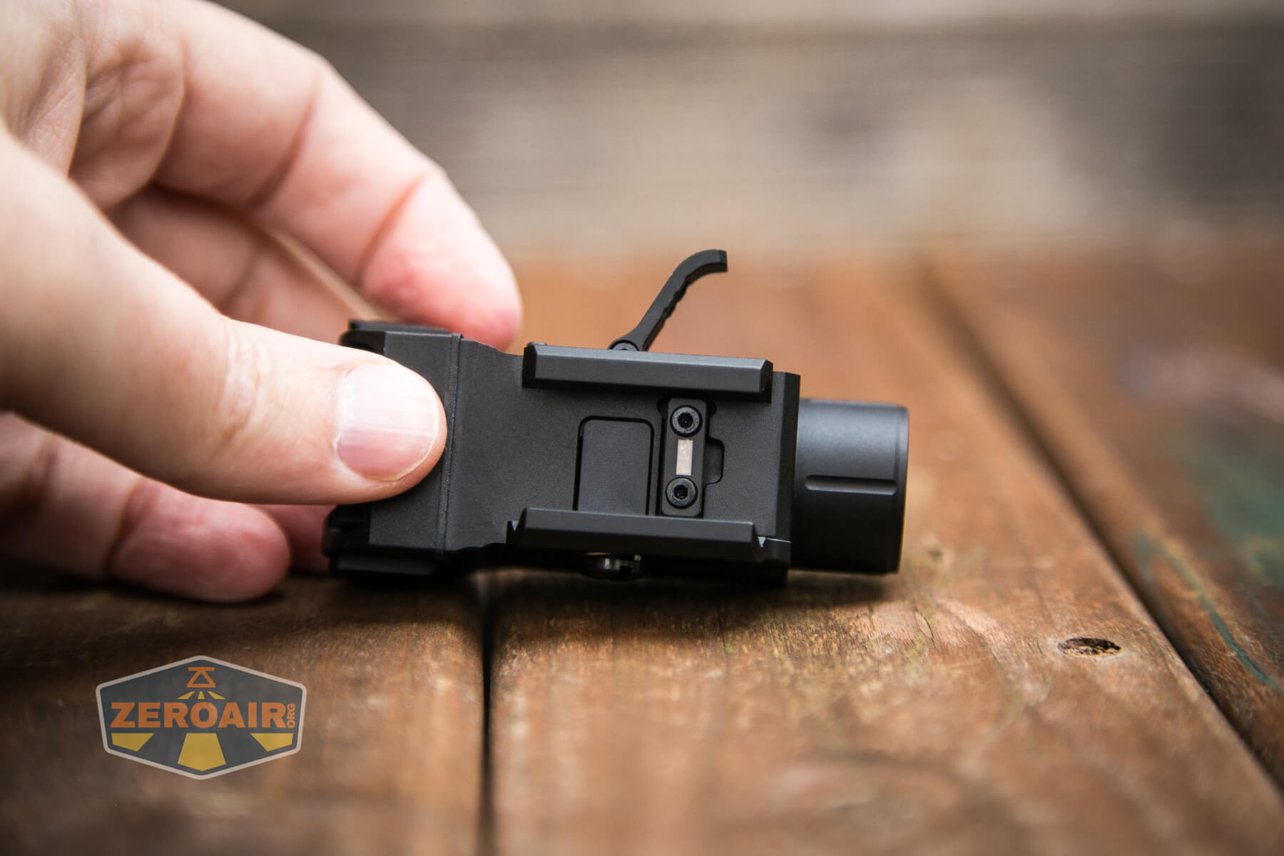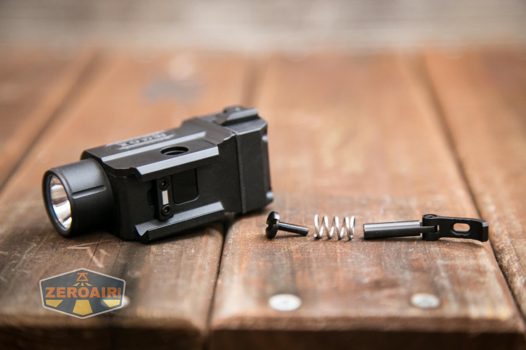 The actual tool-less-ness of it works quite well, actually. This little lever flips out after being pushed toward the back of the light. I don’t think it’ll loosen due to recoil.