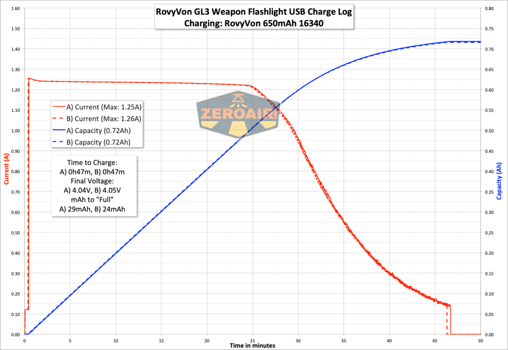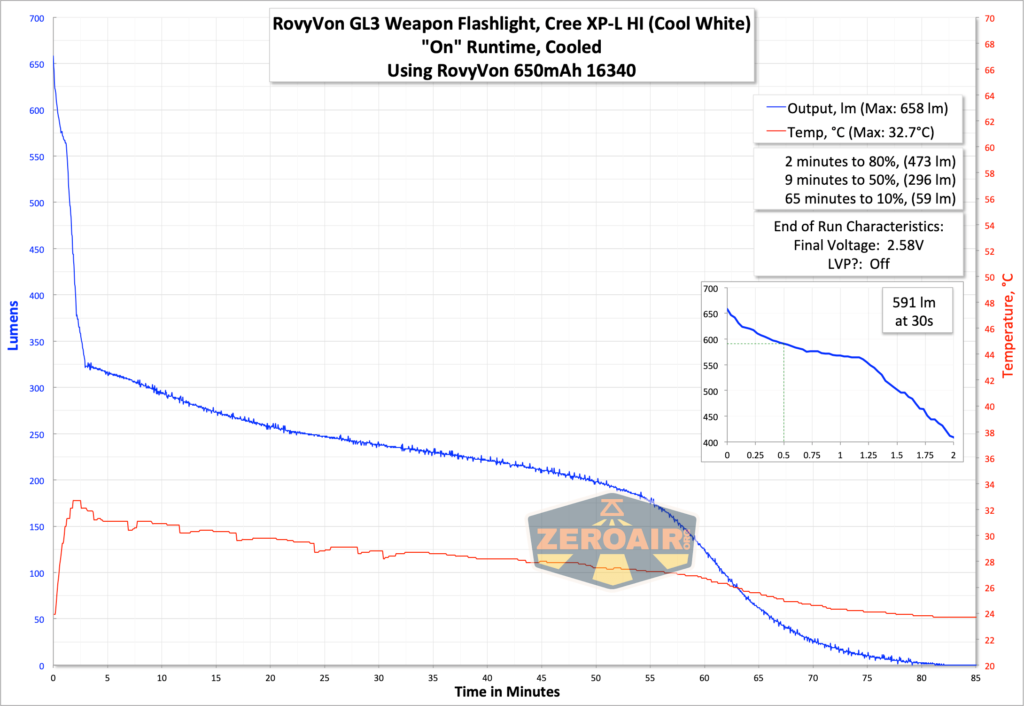 The RovyVon GL3 weapon flashlight runs on a single 16340 cell. An appropriate cell is included – a 650mAh 16340. This is a standard button-top cell, too.