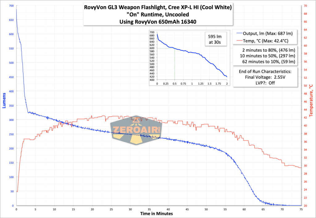 ^ Measurement disclaimer: Testing flashlights is my hobby. I use hobbyist-level equipment for testing, including some I made myself. Try not to get buried in the details of manufacturer specifications versus measurements recorded here; A certain amount of difference (say, 10 or 15%) is perfectly reasonable.