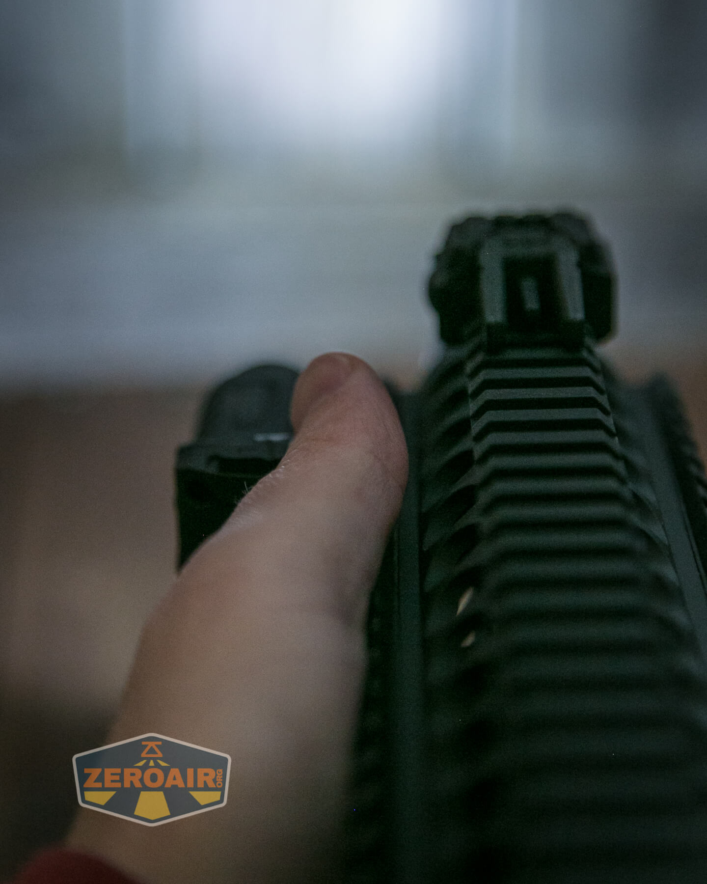 With the two switches being on the sides, it’s very inconvenient on a long gun like this. On a pistol, those switches would be in the perfect location, of course.