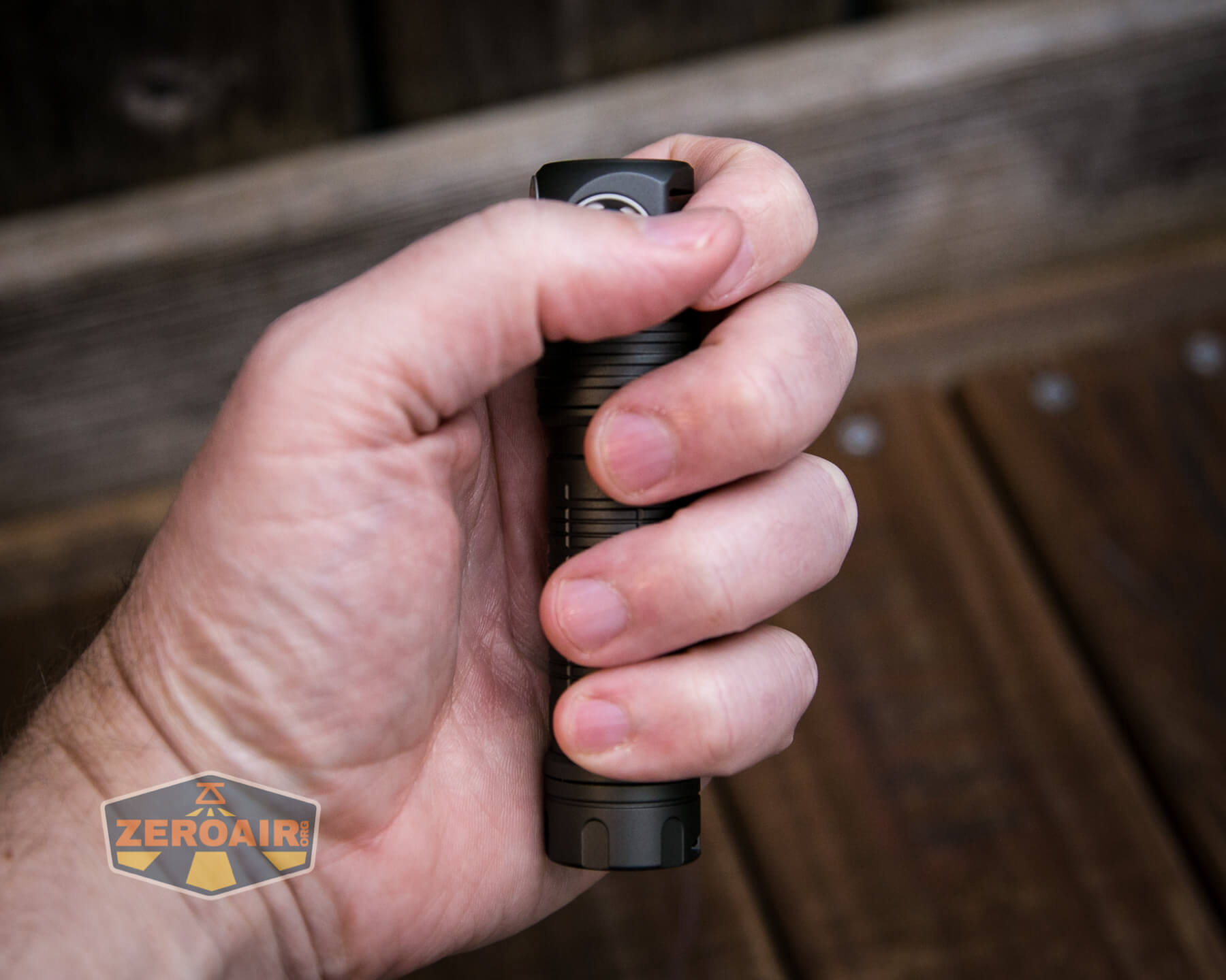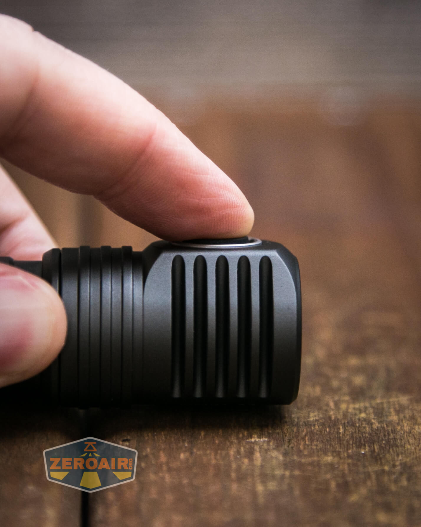 The Skilhunt H300 is operated by a single switch. It’s an indicating e-switch on the head. The switch has a silicone cover and is black, but still translucent. It requires minimal force and has a positive, quiet actuation. If you’ve had other Skilhunt headlamps, you’ll be very comfortable with this switch.