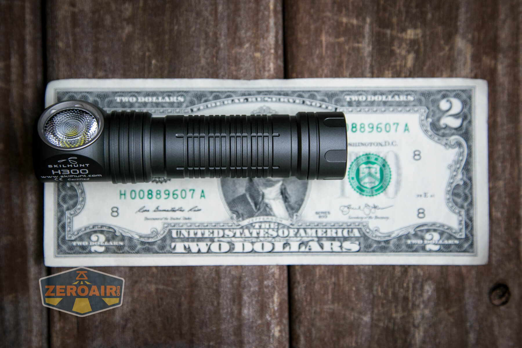 A black Skilhunt H300 flashlight with textured grip lies on a wooden surface. The ZeroAir logo appears in the bottom left corner of the image.