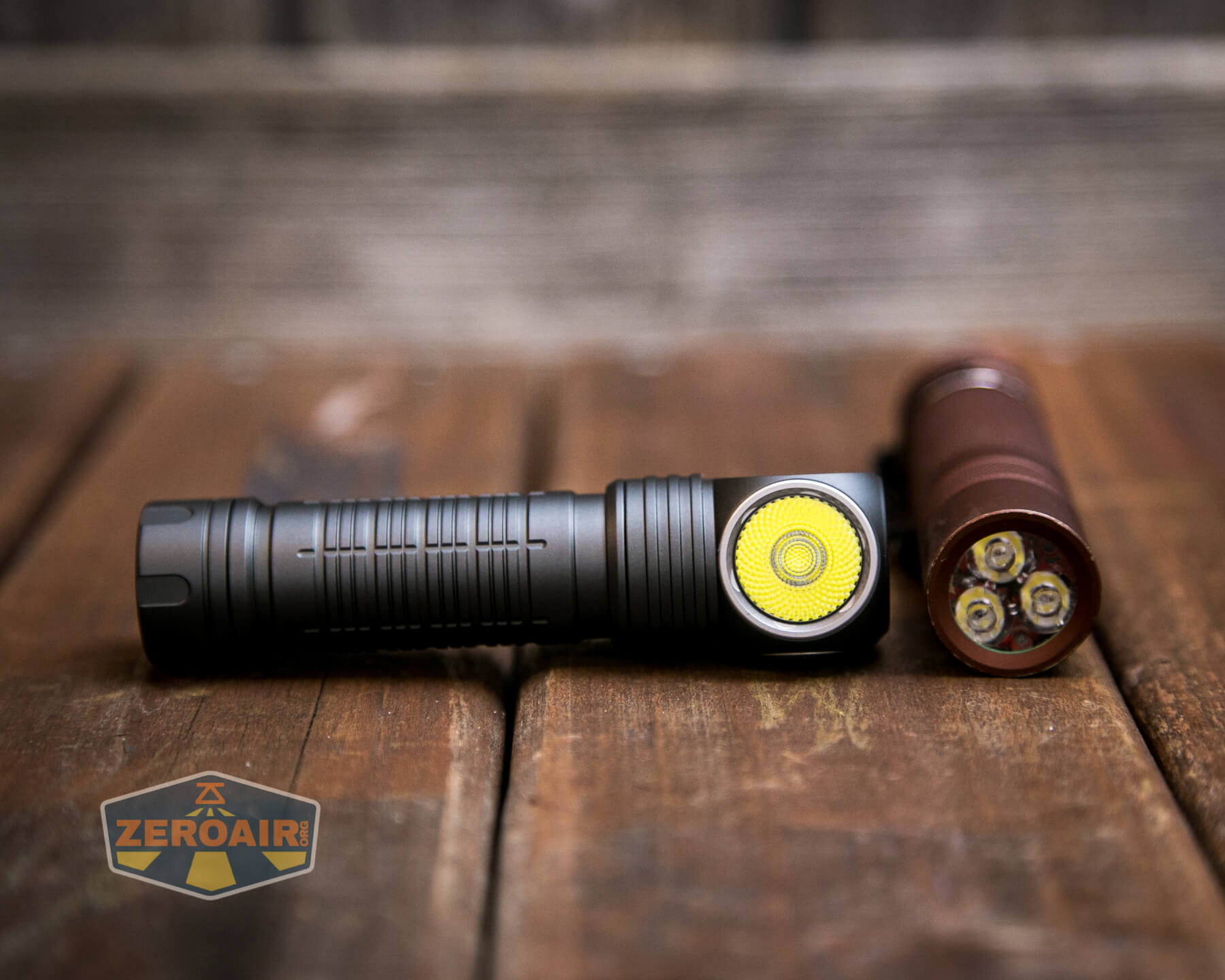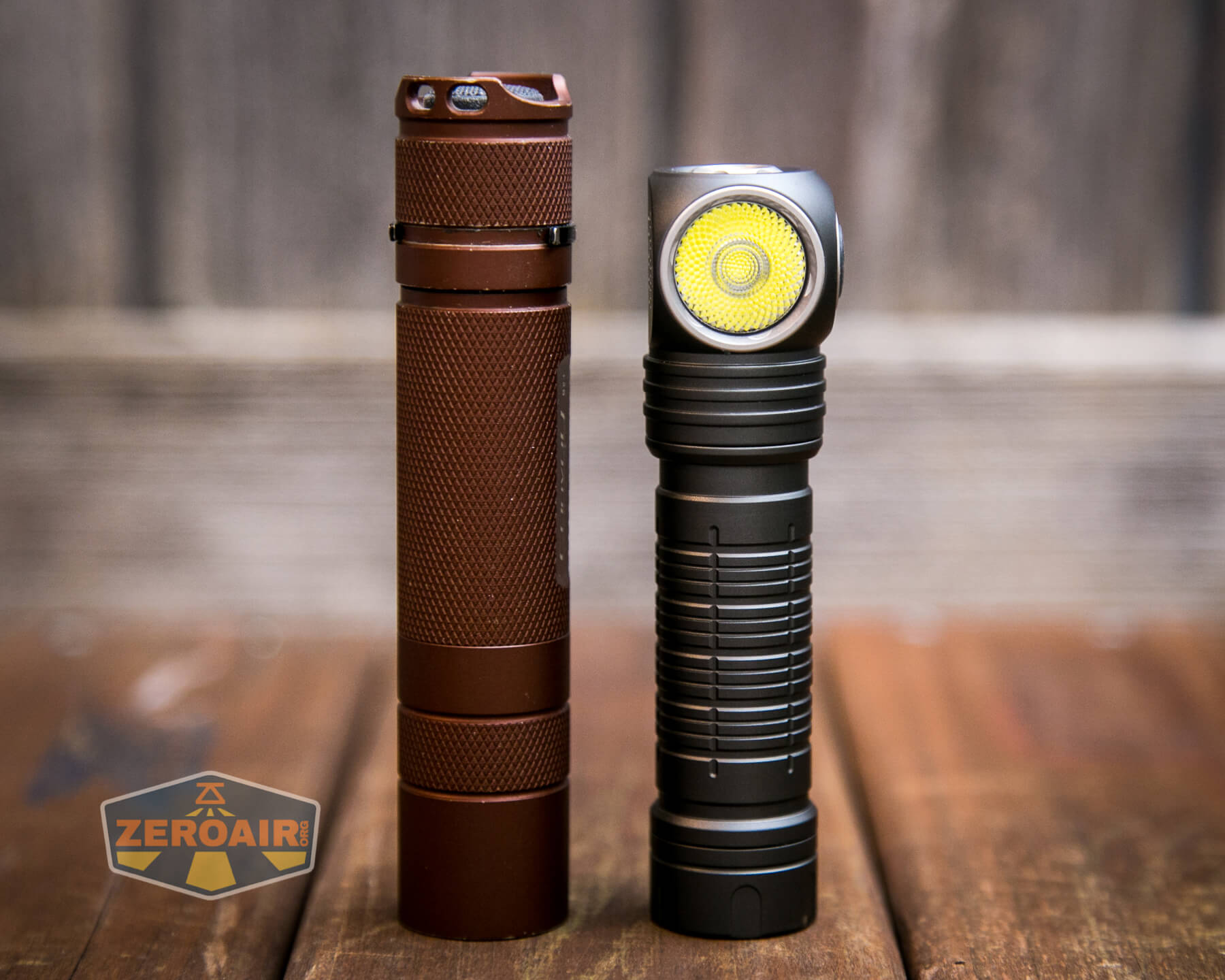 And here’s the light beside my custom-engraved TorchLAB BOSS 35, an 18350 light. I reviewed the aluminum version of that light in both 35 and 70 formats.