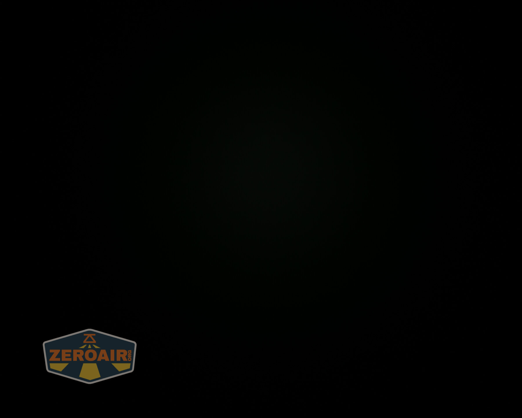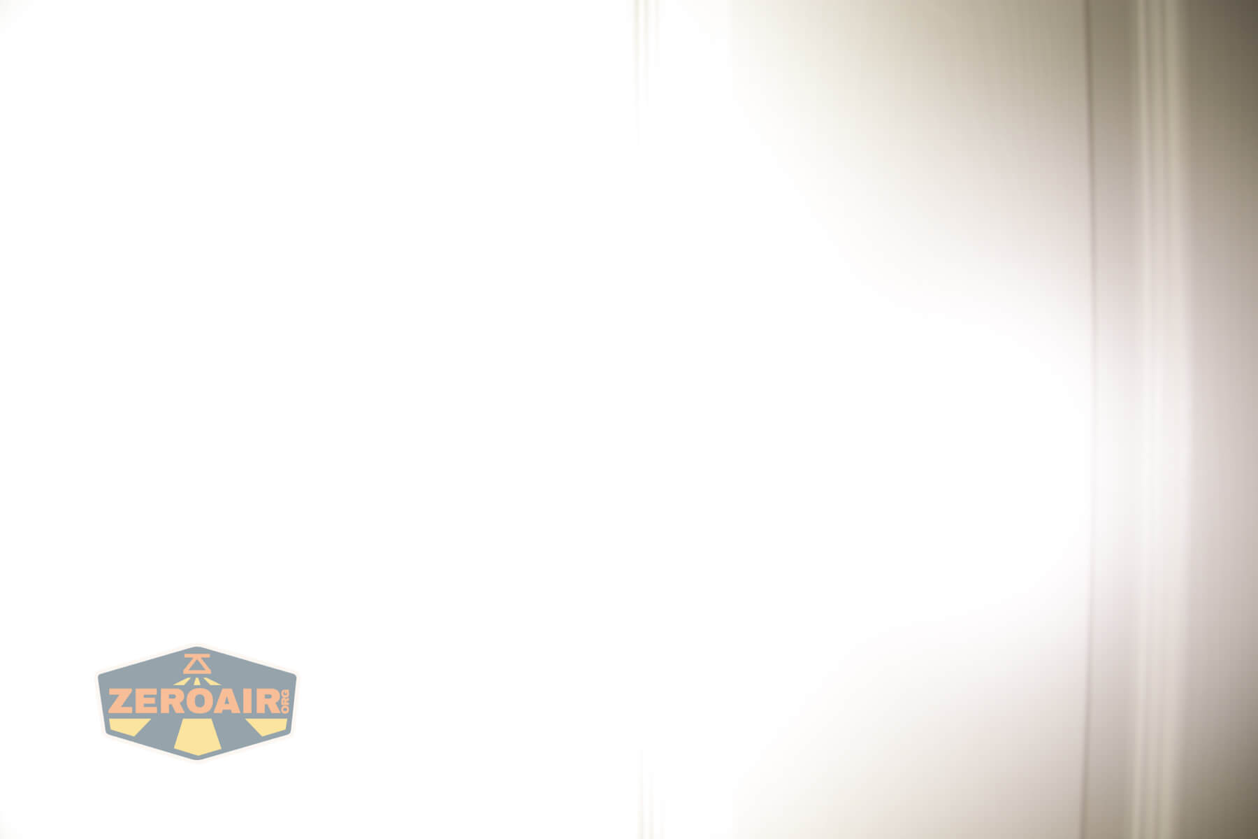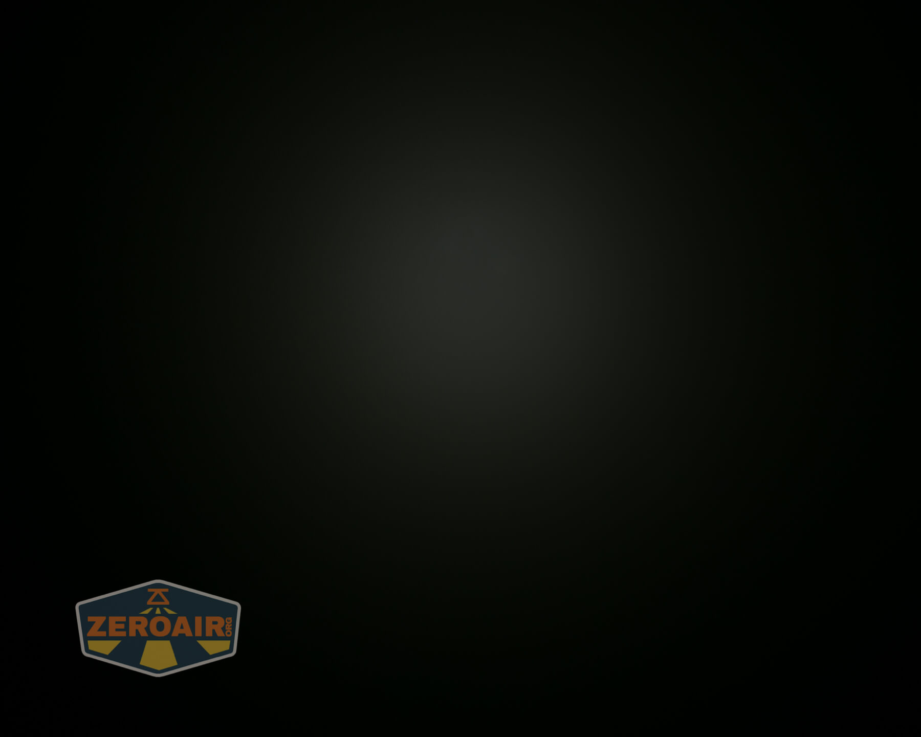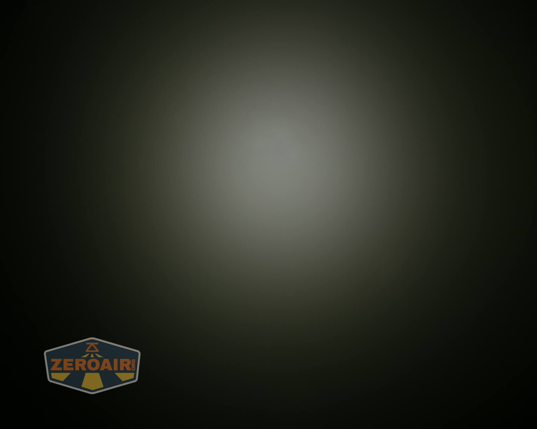 A hand presses the side button of a small, black, ribbed flashlight placed on a wooden surface. A ZEROAIR logo is visible in the bottom left corner.