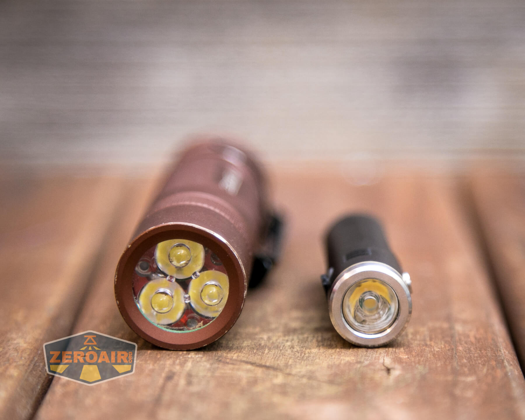 And here’s the light beside my custom-engraved TorchLAB BOSS 35, an 18350 light. I reviewed the aluminum version of that light in both 35 and 70 formats.