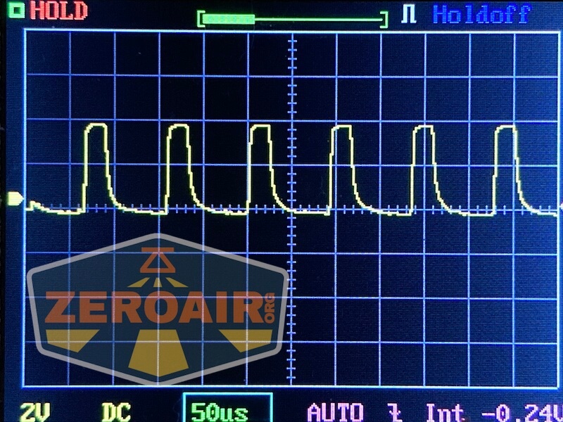 Then there’s the Ultrafire WF-602C flashlight, which has some of the worst PWM I’ve seen. It’s so bad that I used a post about it to explain PWM! Here are multiple timescales (10ms, 5ms, 2ms, 1ms, 0.5ms, 0.2ms) to make comparing this “worst” PWM light to the test light easier. That post also explains why I didn’t test the WF-602C at the usual 50us scale.