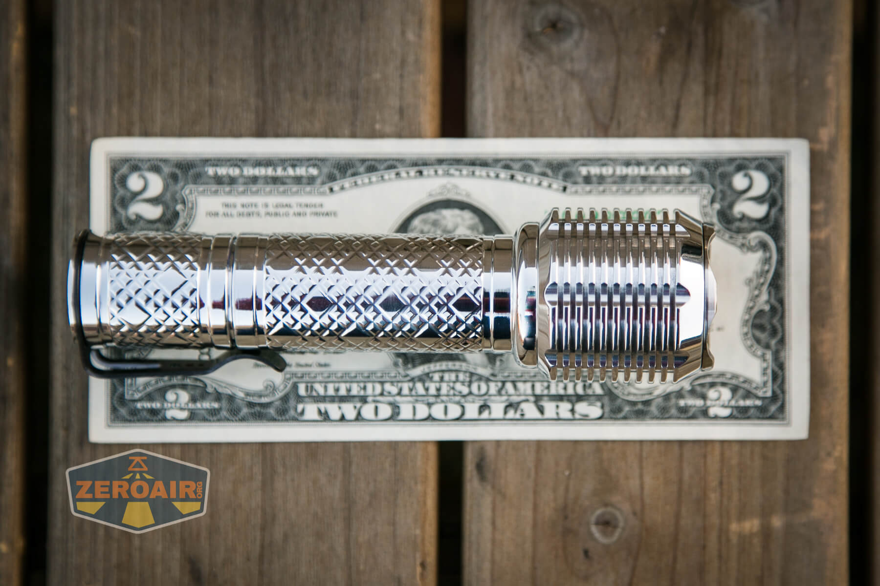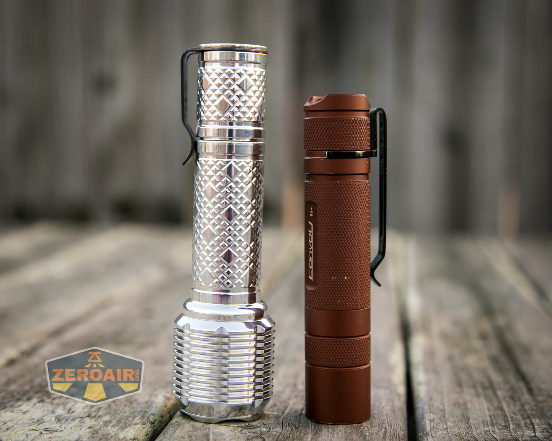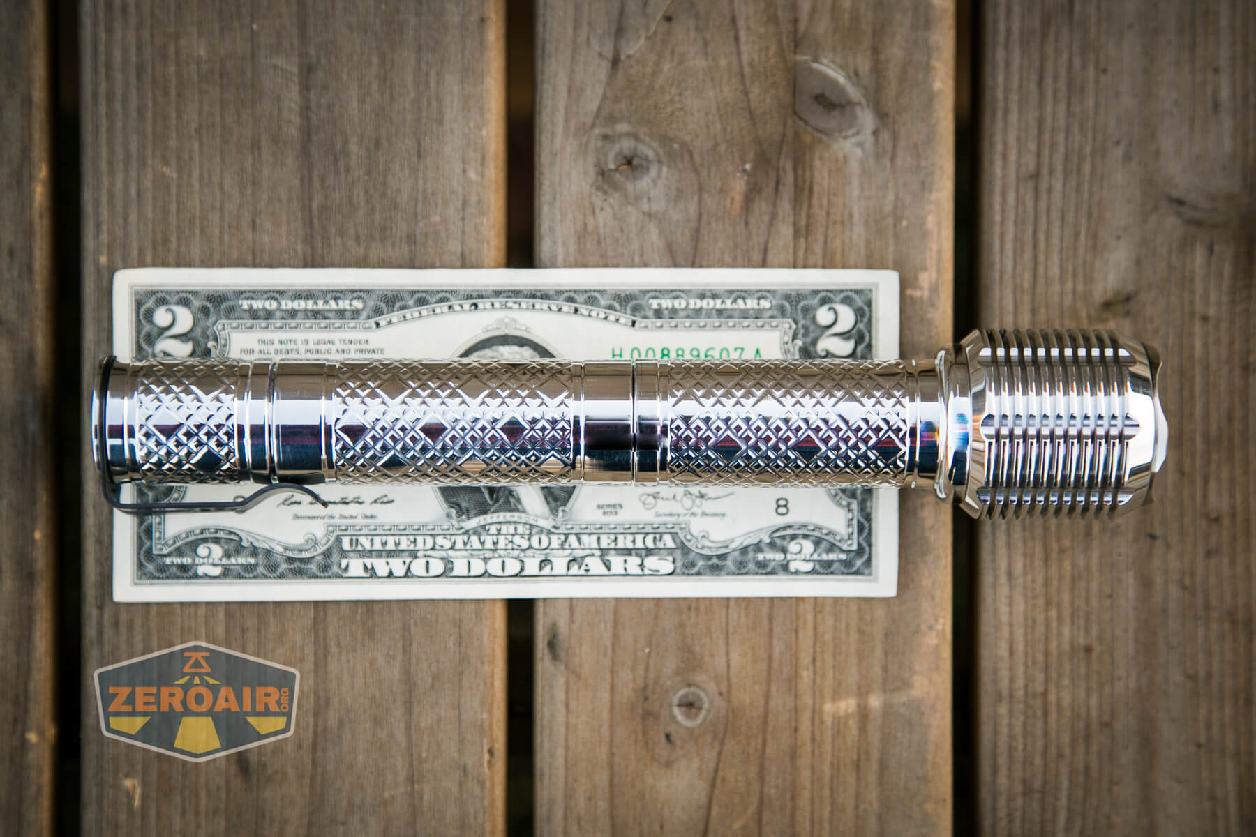 And here’s the light beside my custom-engraved TorchLAB BOSS 35, an 18350 light. I reviewed the aluminum version of that light in both 35 and 70 formats.