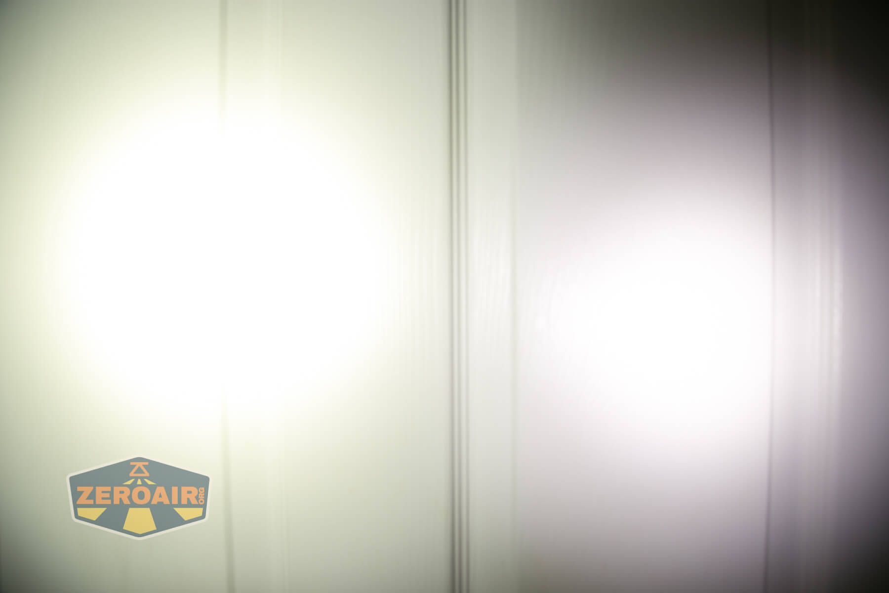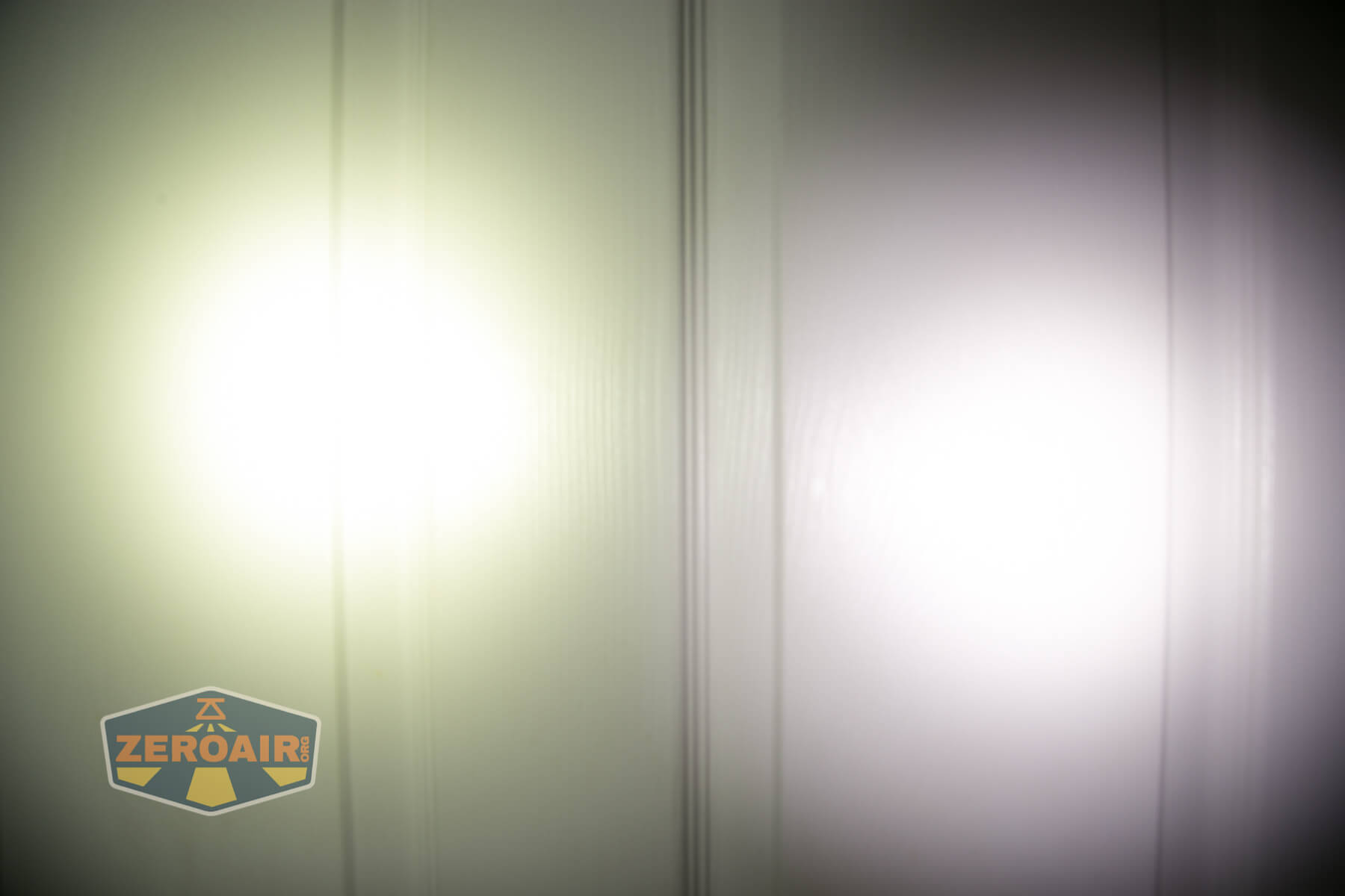 I keep the test flashlight on the left and the BLF-348 reference flashlight on the right. In all these series photos below, the order is as follows: Lowest is the lowest when in ramping mode. Next are all the stepped modes. Finally (the right-most) is the output when the switch is double-clicked with the light on.