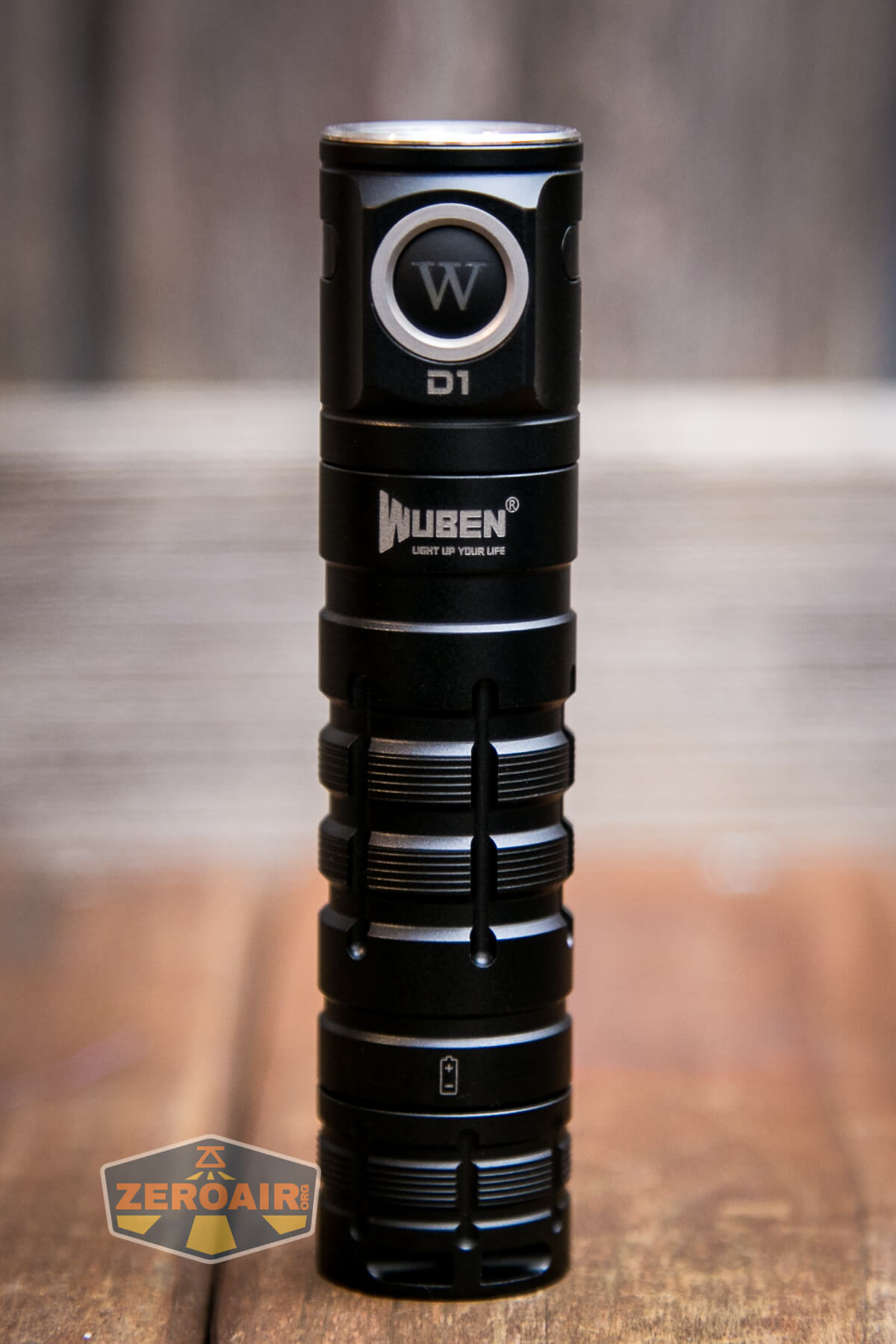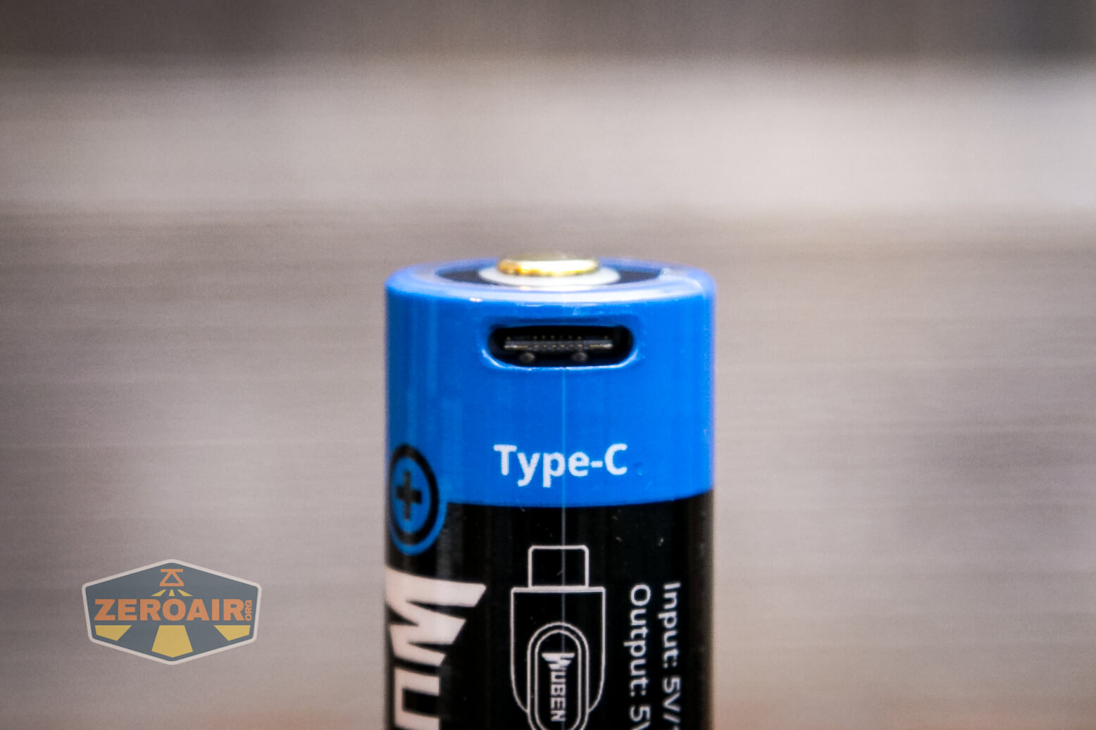 While the Wuben D1 flashlight doesn’t have onboard charging, the included cell does. There’s a USB-C charging port on the positive end.