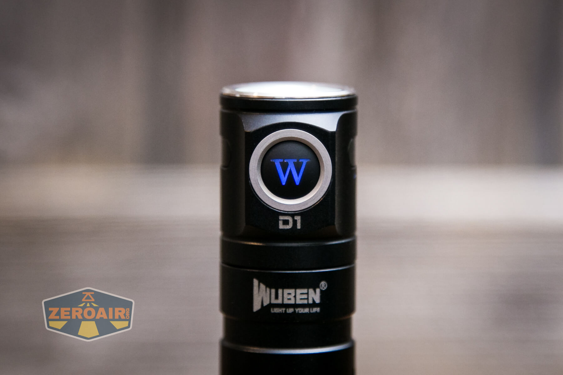 A single switch controls the Wuben D1. It’s an indicating e-switch and has Wuben’s “W” logo. The logo is very evenly lit and can be multiple colors.