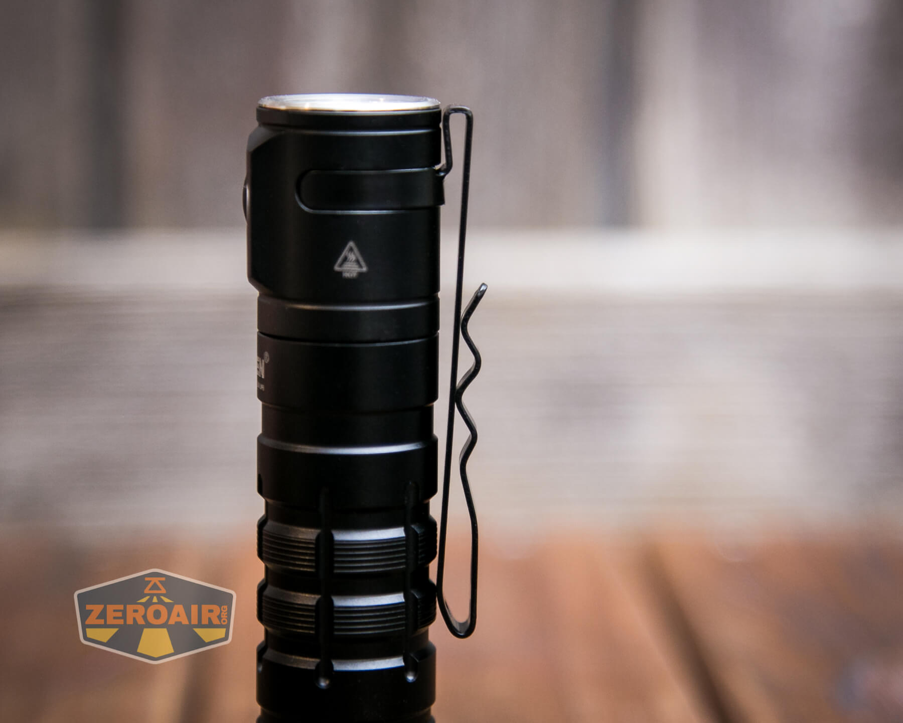 The “right way’ to use this two-way clip allows very deep carry (which I like), but the other way of the two-way-ness of this clip is the opposite. When carried this way, the light sticks out of pocket by over an inch. In fact, just under 1.5″ sticks out this way. I don’t personally like this, but if you want easy access with bezel down carry, it’s actually perfect!