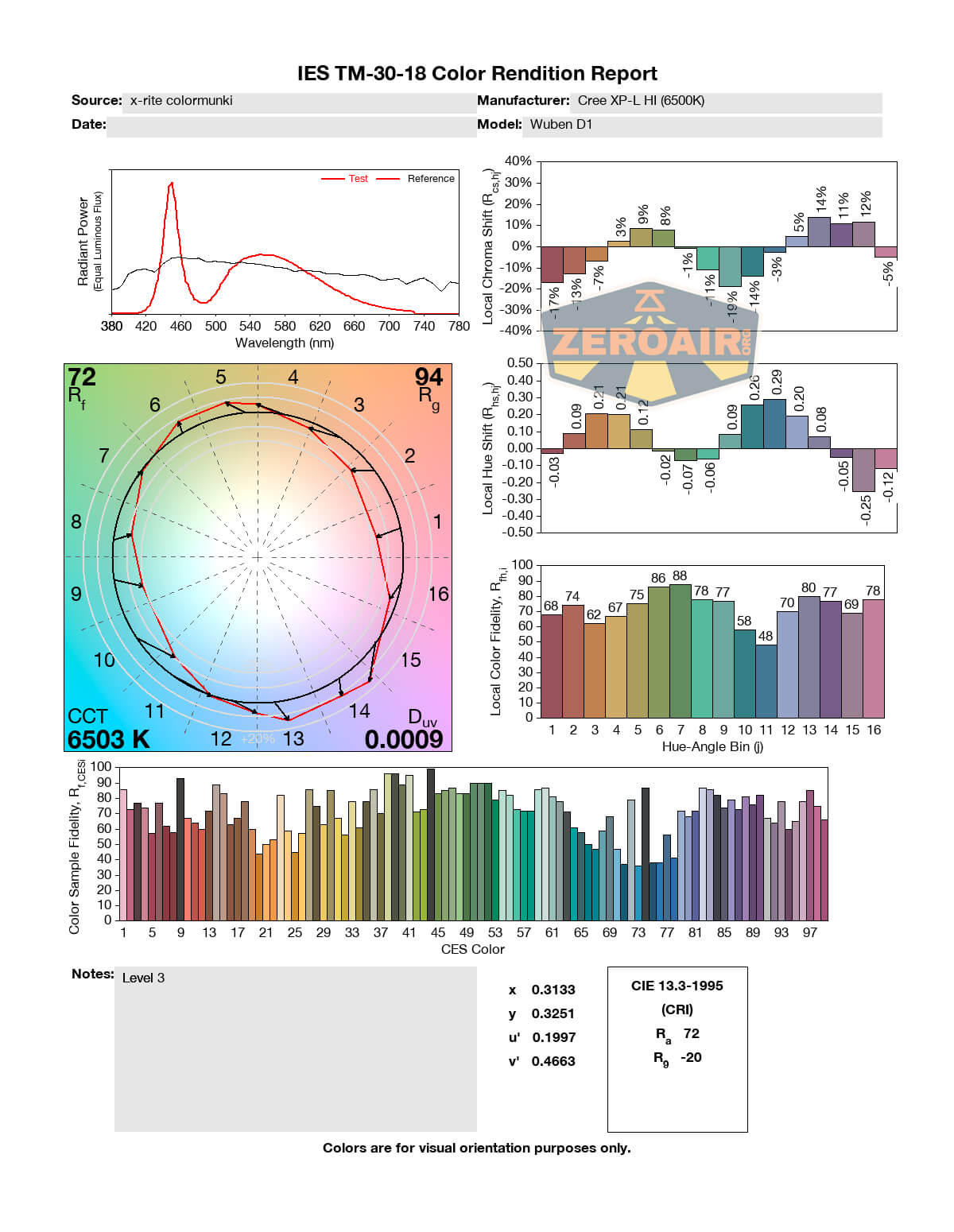 As stated above, Wuben said this is a 6500K Cree XP-L HI. The CRI and CCT measurements I took confirm that. In fact, on the higher output levels, the CCT tends toward cooler than 6500K. Wuben made no CRI claim, but it looks to be in the low 70s.