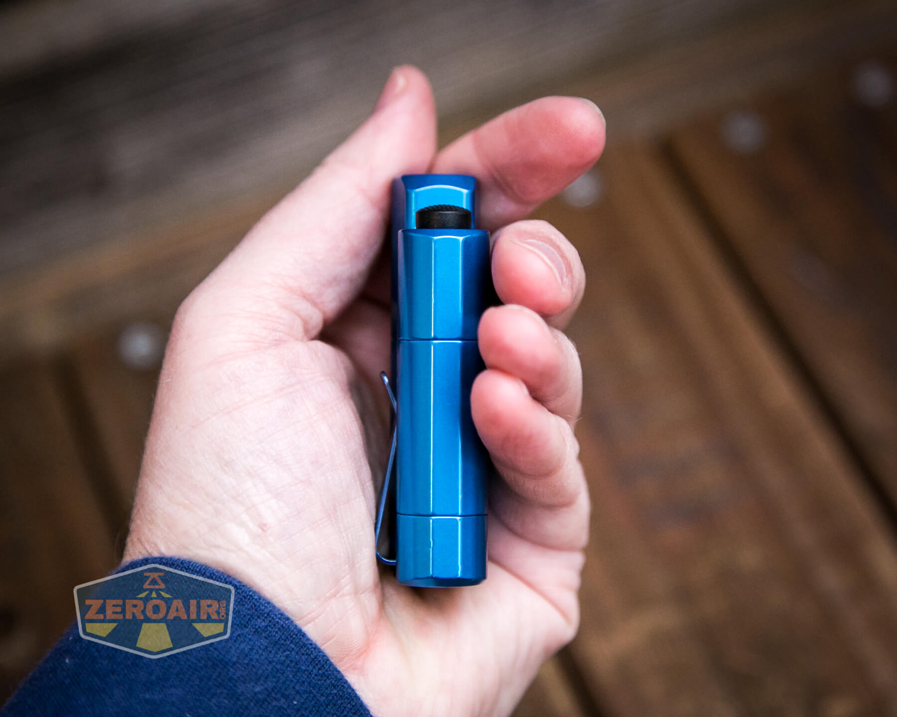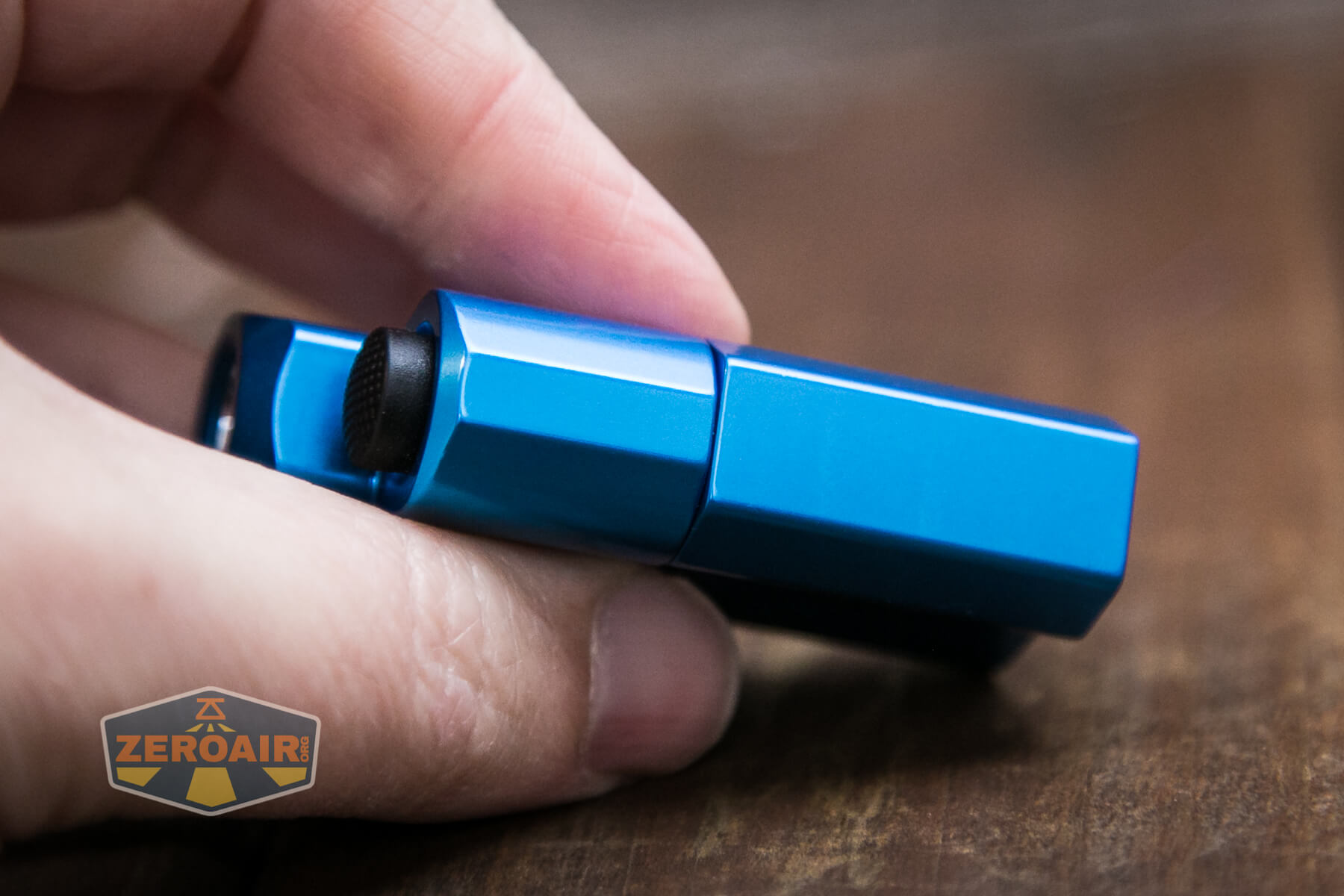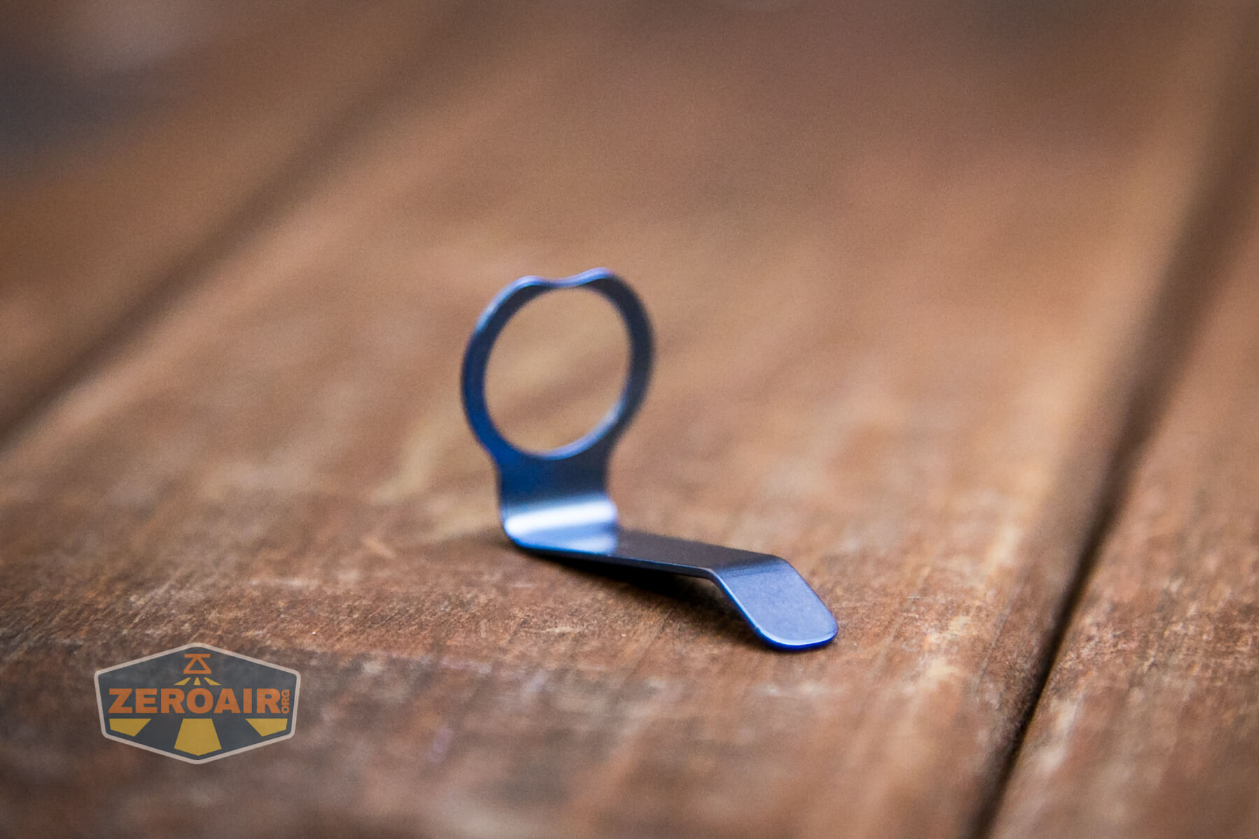 Ah the pocket clip. The pocket clip is really the only included way to carry the Frelux Synergy1 flashlight. Below you can see the clip in blue. There’s also a loop option. This allows connection of a lanyard.
