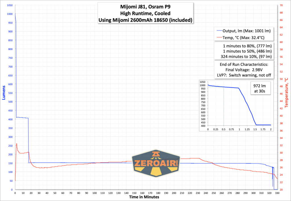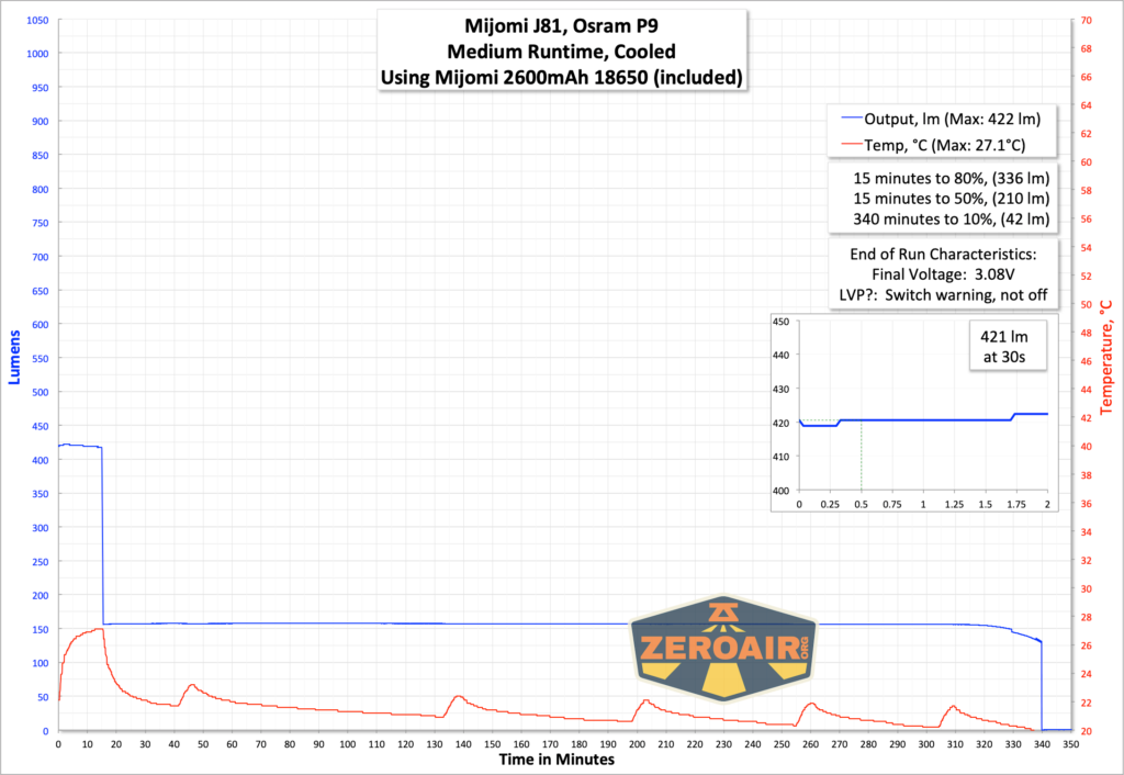 Here are three runtime tests. It looks like the output is well below the claimed 1300 lumens. The stepdown is fairly quick too, but fortunately doesn’t look to be quick in a “game the standard” way. Around 1 minute at the highest output is “fine.”