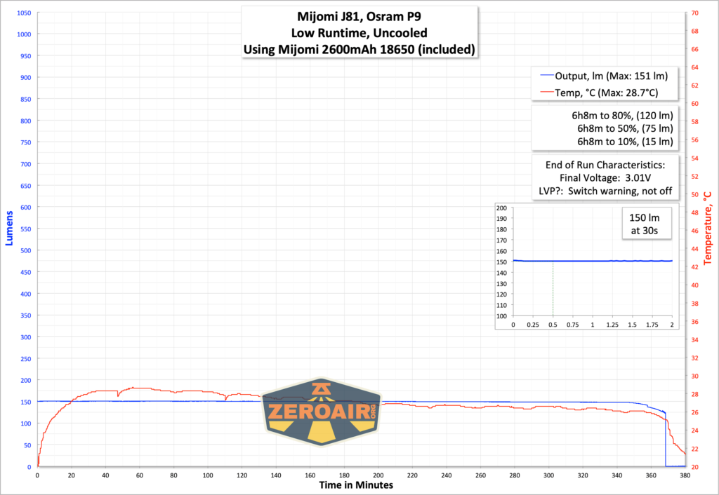 ^ Measurement disclaimer: Testing flashlights is my hobby. I use hobbyist-level equipment for testing, including some I made myself. Try not to get buried in the details of manufacturer specifications versus measurements recorded here; A certain amount of difference (say, 10 or 15%) is perfectly reasonable.
