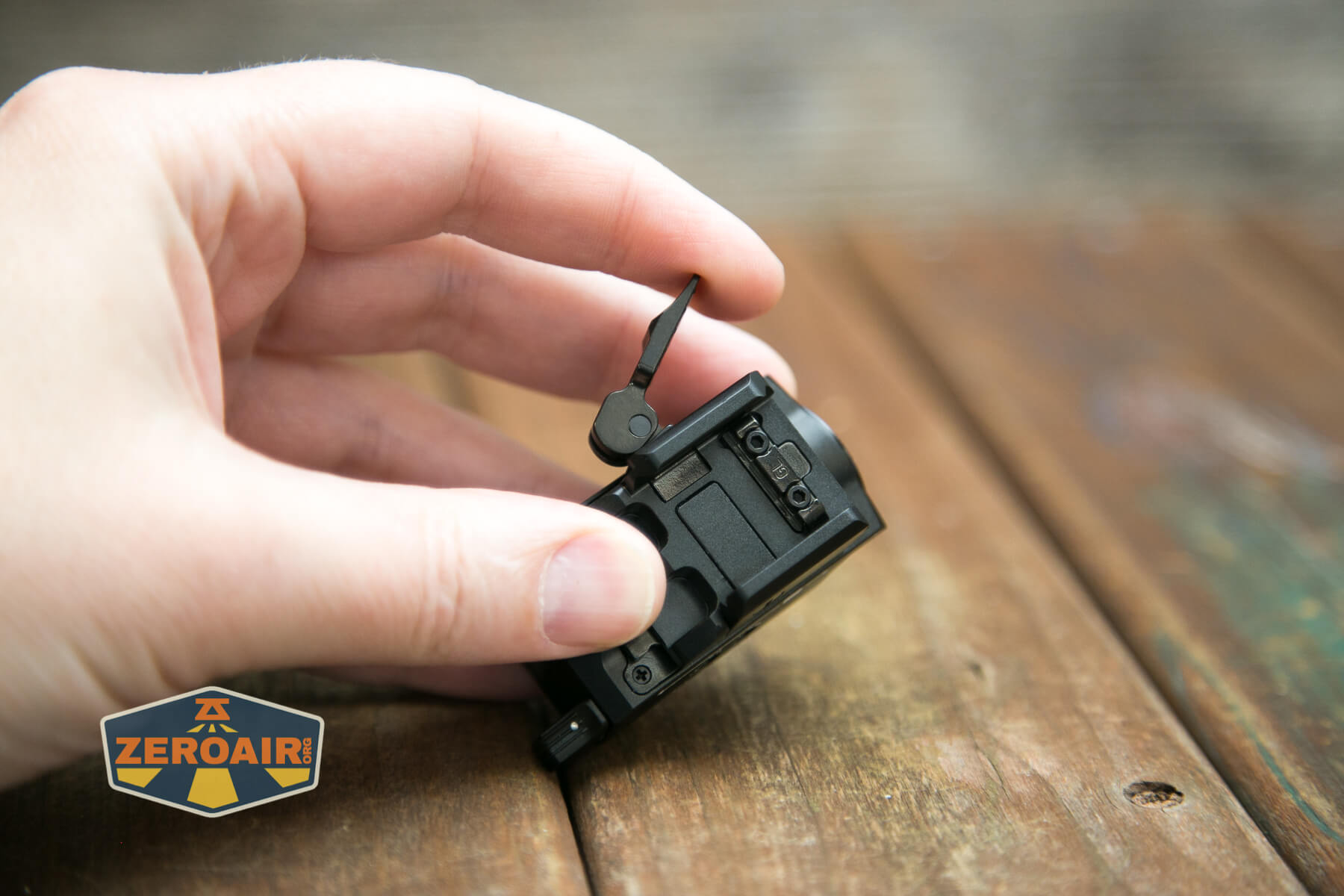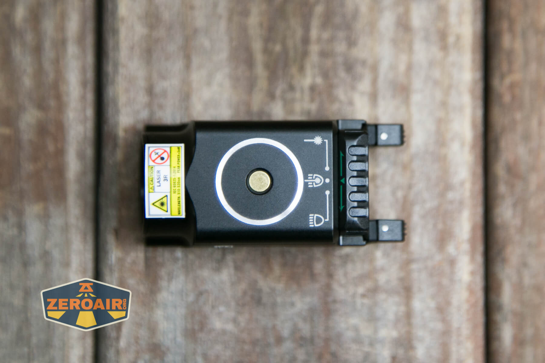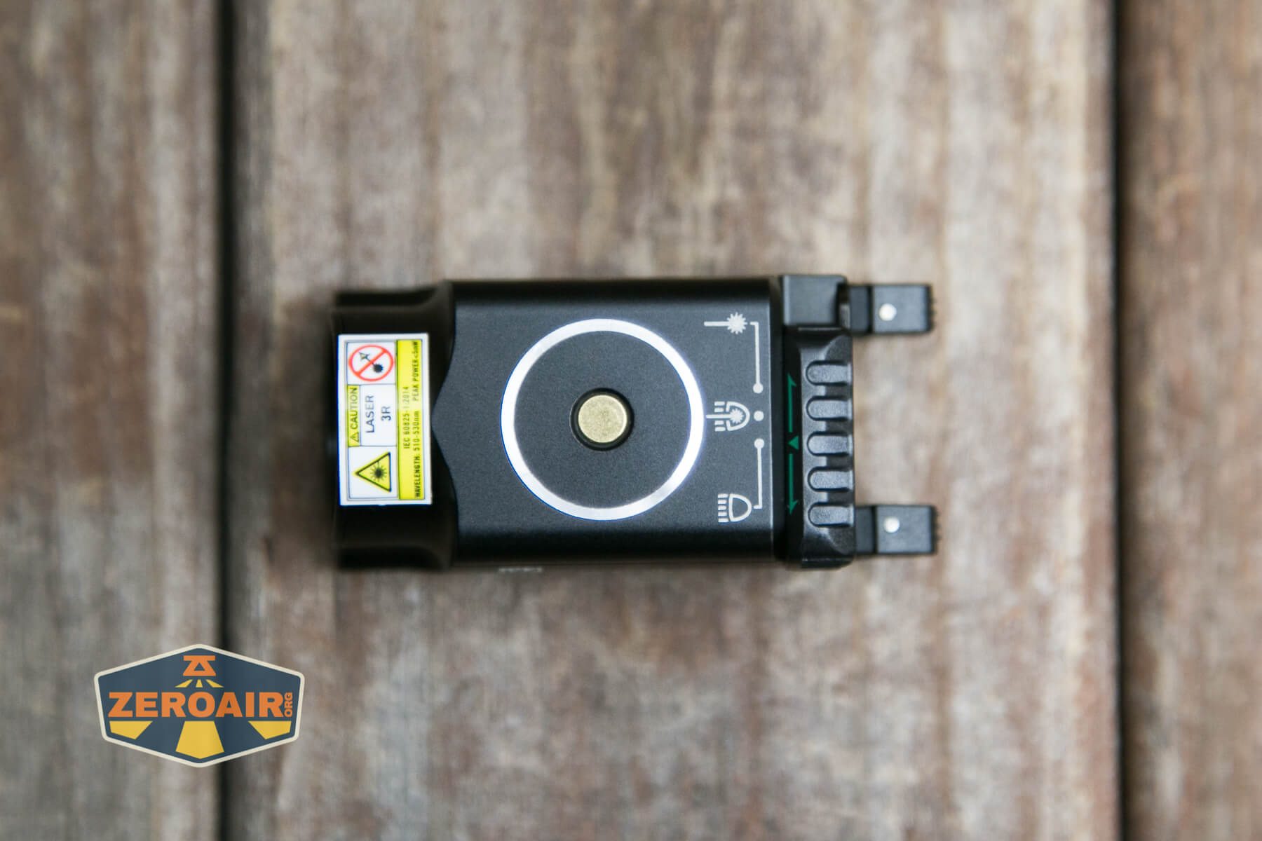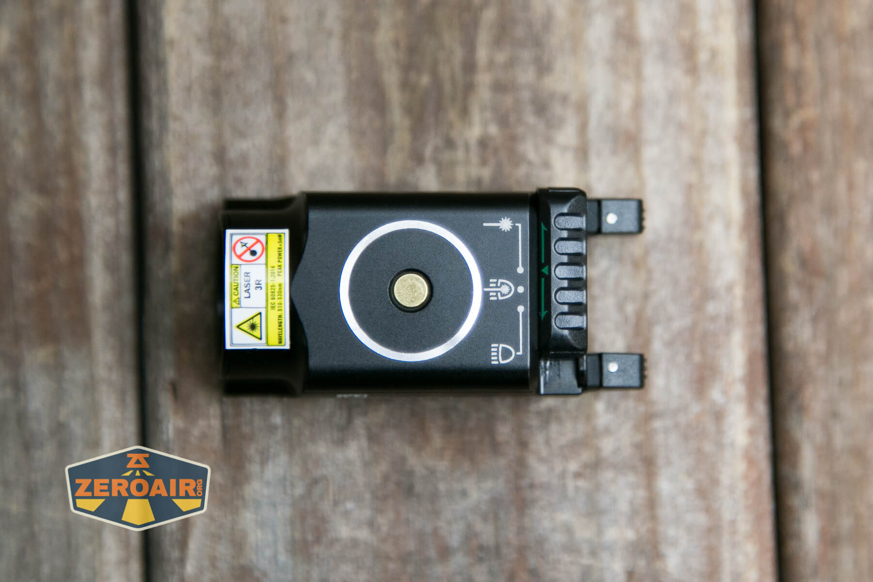 Aside from the switch to turn the light on or off, there’s this selector switch that allows selecting between white light (rightmost, when mounted), white LED and green laser (center position), and green laser (leftmost, when mounted). This switch snaps into place very firmly and I do not have the impression that it’ll move around easily even during operation.
